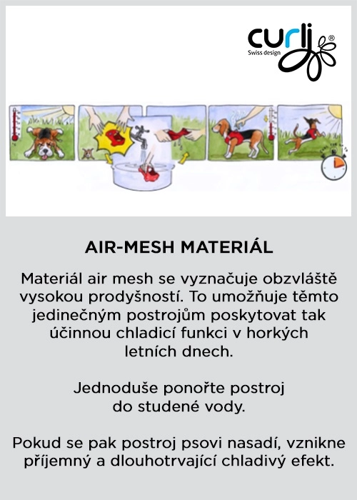 Zračen material Air-Mesh je mehak, hitro sušeč in po namočenju v hladno vodo nudi dolgotrajen hladilni učinek v vročih dneh. Podložena zaponka ščiti dlako pred zatikom, odbojni detajli povečajo vidnost v mraku, čvrsta konstrukcija pa prenese natezno obremenitev do 100 kg. Velikost preprosto prilagodite s ježkom, pripenjanje povodca pa opravite z eno roko.