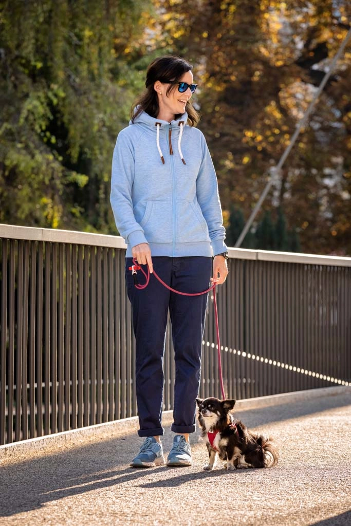 Močna zaponka z vzdržljivostjo do 100 kg omogoča bliskovito pripenjanje povodca brez klikanja D-obročev in brez zatikovanja dlake.