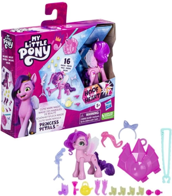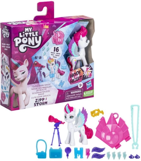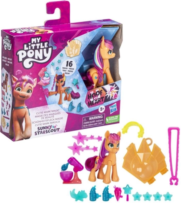Komplet My Little Pony Čarobni Cutie Mark prinaša otrokom ustvarjalno igro, pri kateri lahko odkrivajo in menjajo čarobne simbole Cutie Mark. Pripnite talismane in obeske na stilski ključek enotnosti, okrasite ponijevo grivo in odkrivajte nove kombinacije. Pozirajoči 8 cm poni omogoča ustvarjanje prizorov in zgodb kot v seriji.