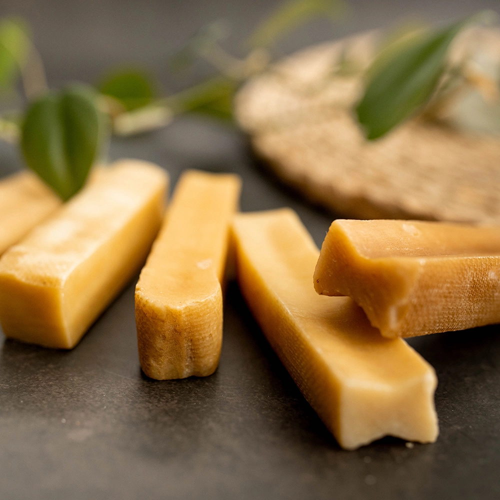 Himalajske sirne palčke XXL z lanenim semenom so izdelane po tradicionalni metodi: mleko se dolgo kuha za pasterizacijo in odstranjevanje maščobe, nato se skuti s ščepcem soli in limetinim sokom, zatem se več dni stiska in suši v dimnici 20–30 dni. Rezultat je izjemno trd in dolgotrajen priboljšek, ki psa zaposli in naravno podpira čiste zobe in svež dah.