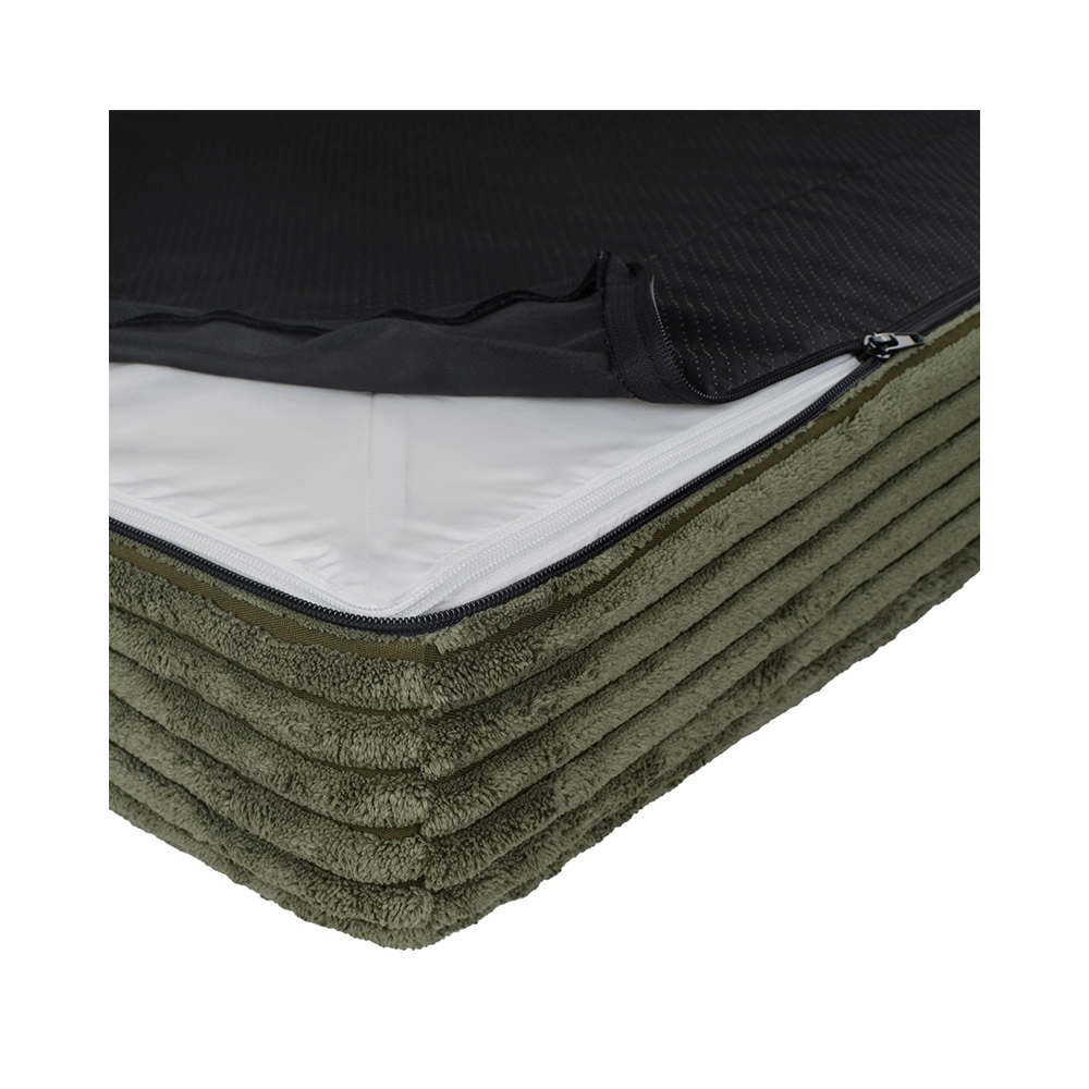 Prevleka iz finega rebrastega žameta (100 % poliester) je mehka, hitro sušeča in odporna proti vonjavam, s certifikatom OEKO-TEX Standard 100. Peno jedro s certifikatom CertiPUR-US ne vsebuje škodljivih snovi. Zaradi zadrg YKK prevleko zlahka snamete in operete v stroju pri 30 °C. Vodoodporna notranja plast ščiti jedro pred vlago, nedrseča spodnja stran pa ležalnik trdno drži na mestu tako na ploščicah kot na laminatu.