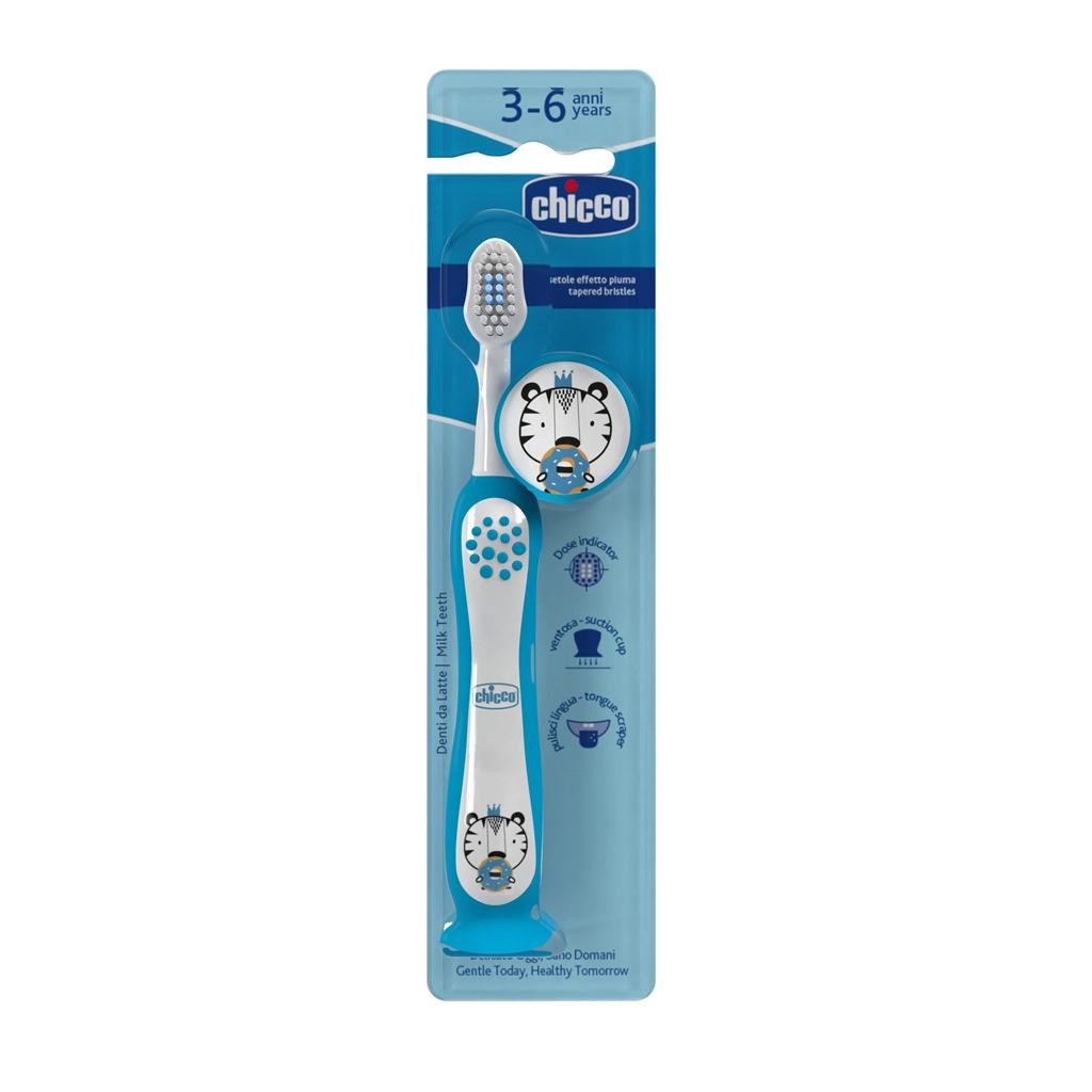 Otroška zobna ščetka Chicco Tiger je zasnovana posebej za otroke, stare 3–6 let. Ima izjemno mehke stožčaste ščetine za nežno čiščenje zob in dlesni, ergonomski nedrseč ročaj ter ozko glavico za lahek dostop do vseh mest v ustih. Priloženi so higienski pokrovček, prisesek za stabilno odlaganje in indikator pravilnega odmerka paste na sredini glavice.