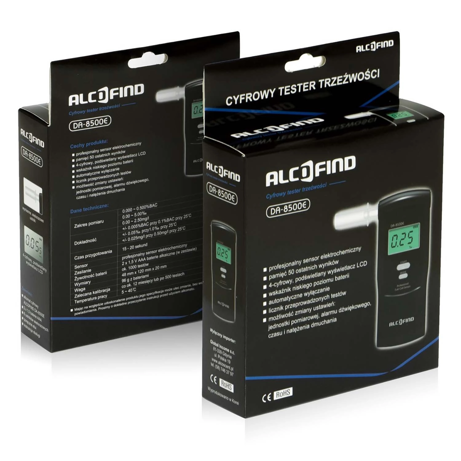 Alkotester DA-8500E spada med najbolj priljubljene osebne testerje treznosti zahvaljujoč profesionalnemu elektrokemičnemu senzorju, ki reagira izključno na alkohol. To zagotavlja zanesljivost in stabilno natančnost merjenja do stotink promila v širokem razponu do 5,00 ‰. Pregleden osvetljen zaslon, zvočni signali pripravljenosti ter začetka/konca merjenja in indikator stanja baterije omogočajo udobno in varno uporabo.