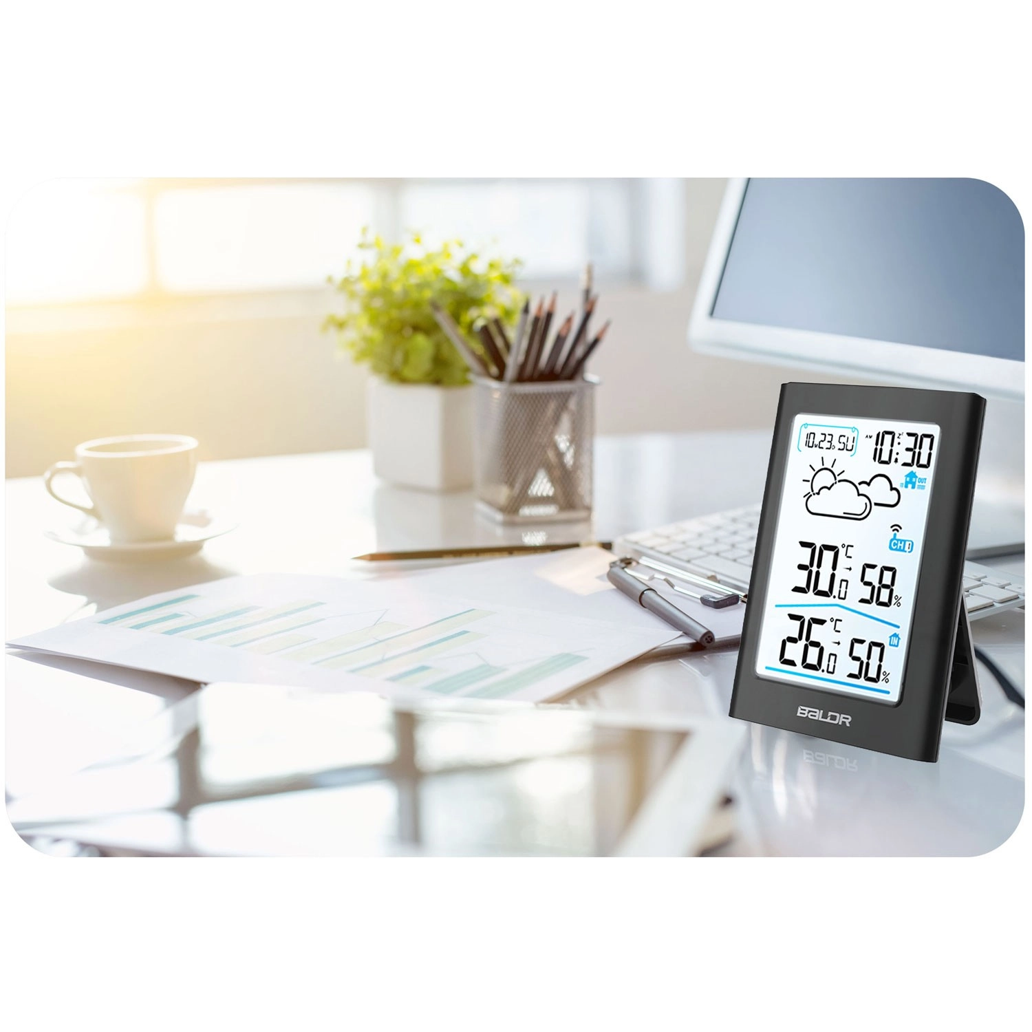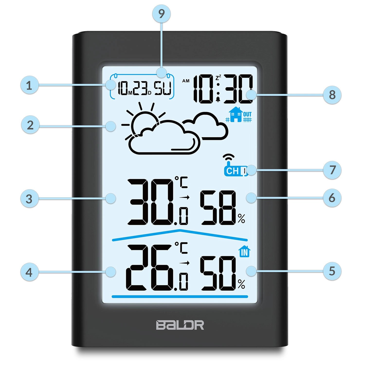 Velike, lahko berljive številke prikazujejo čas, datum, temperaturo in vlažnost iz notranjosti in zunanjosti. Osvetlitev omogoča brezskrbno branje podnevi in ponoči.