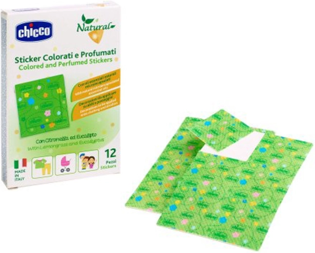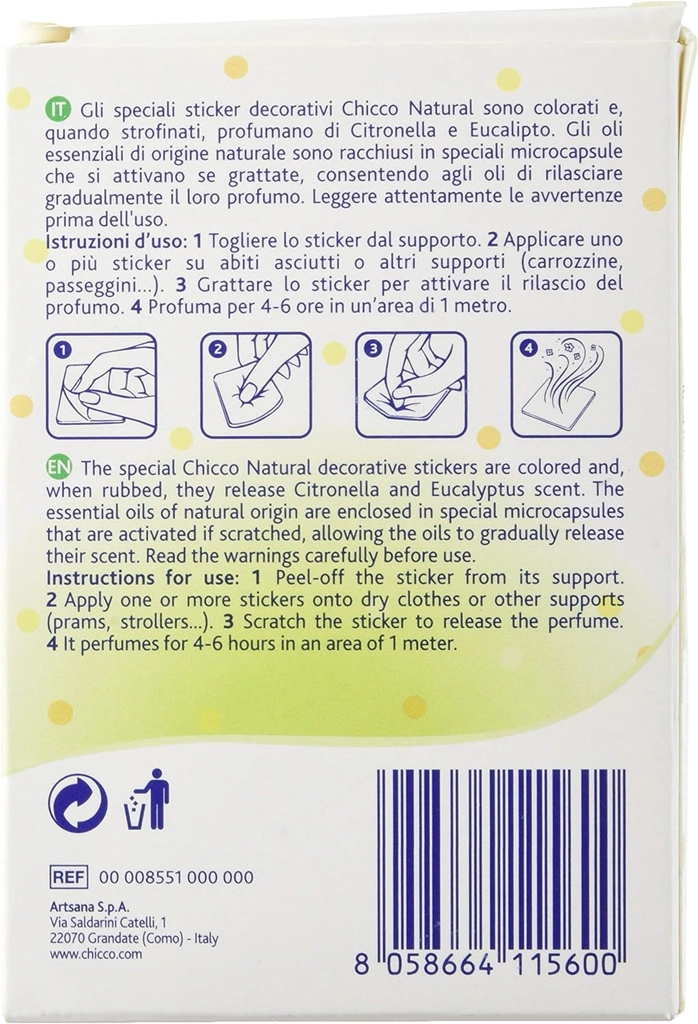 Zaščitite sebe in svoje otroke pred nadležnimi žuželkami z naravnimi dišečimi nalepkami Chicco. Zaradi eteričnih olj (citronova trava in eukaliptus citriodora) ter mikrokapsul se dišava postopoma sprošča po aktivaciji z drgnjenjem. Nalepke so idealne za aktivnosti na prostem, izlete in vsakodnevno uporabo.