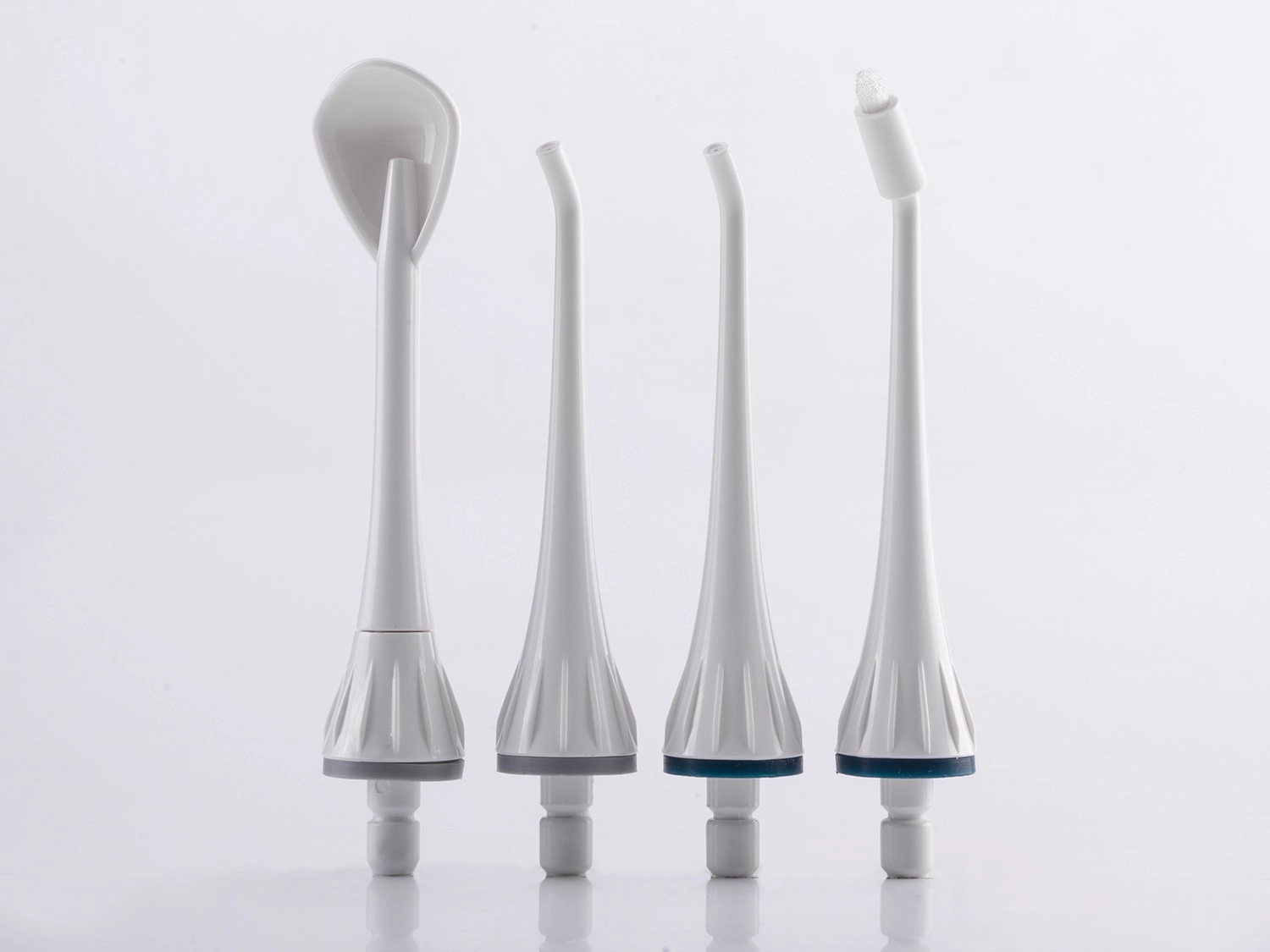 V kompletu 4 specializirane šobe z 360° vrtenjem za maksimalen doseg: dve standardni šobi, strgalo za jezik za svež dah in ortodontska šoba za temeljito čiščenje okoli zobnih aparatov in kron.
