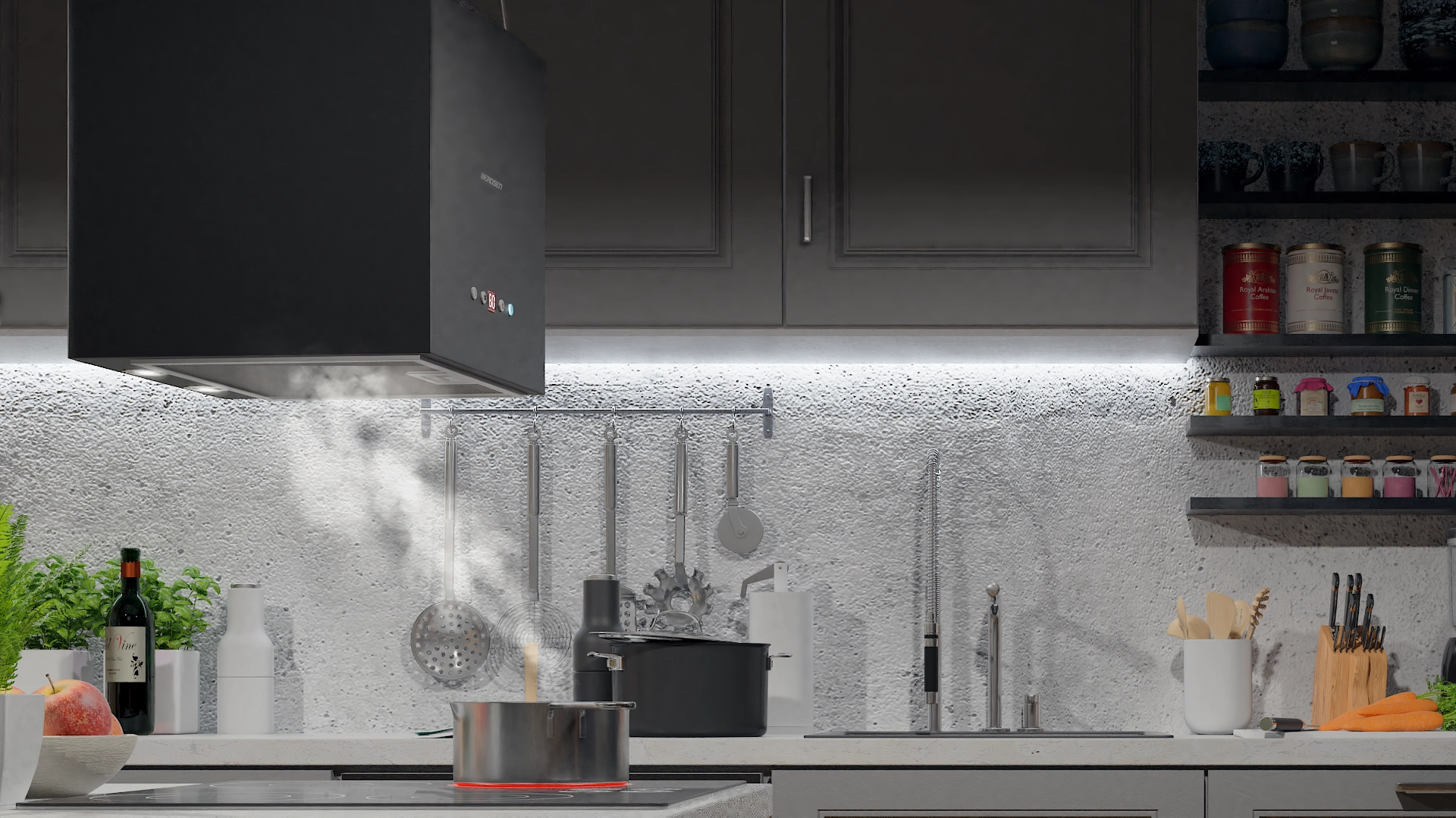 - Sodoben videz za otočne kuhinje – kompaktna 40 cm kocka, obešena na strop.