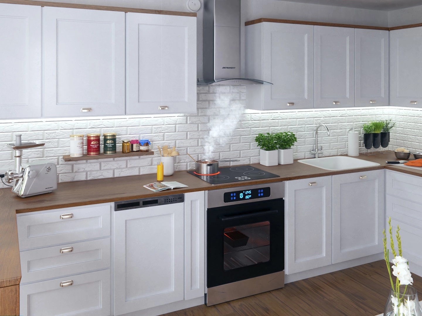 Naprava lahko deluje kot odvod v dimnik ali kot recirkulacijski napajalnik z izbirnimi ogljičnimi filtri BERDSEN BT-S (niso priloženi). Mehansko upravljanje z gumbi je preprosto in vzdržljivo, medtem ko 5-slojni aluminijasti filter proti maščobi zagotavlja enostavno vzdrževanje in visoko učinkovitost filtracije.