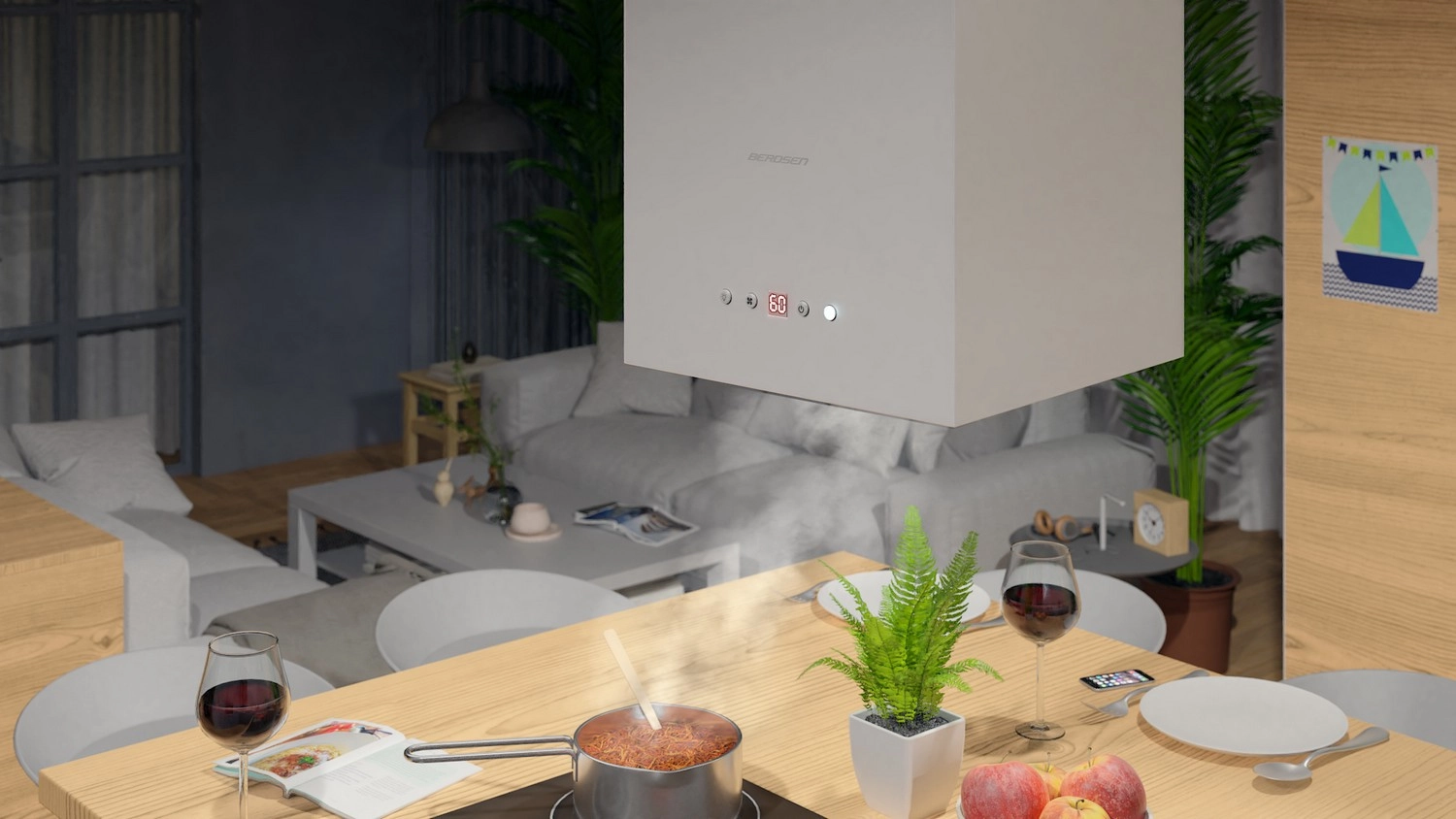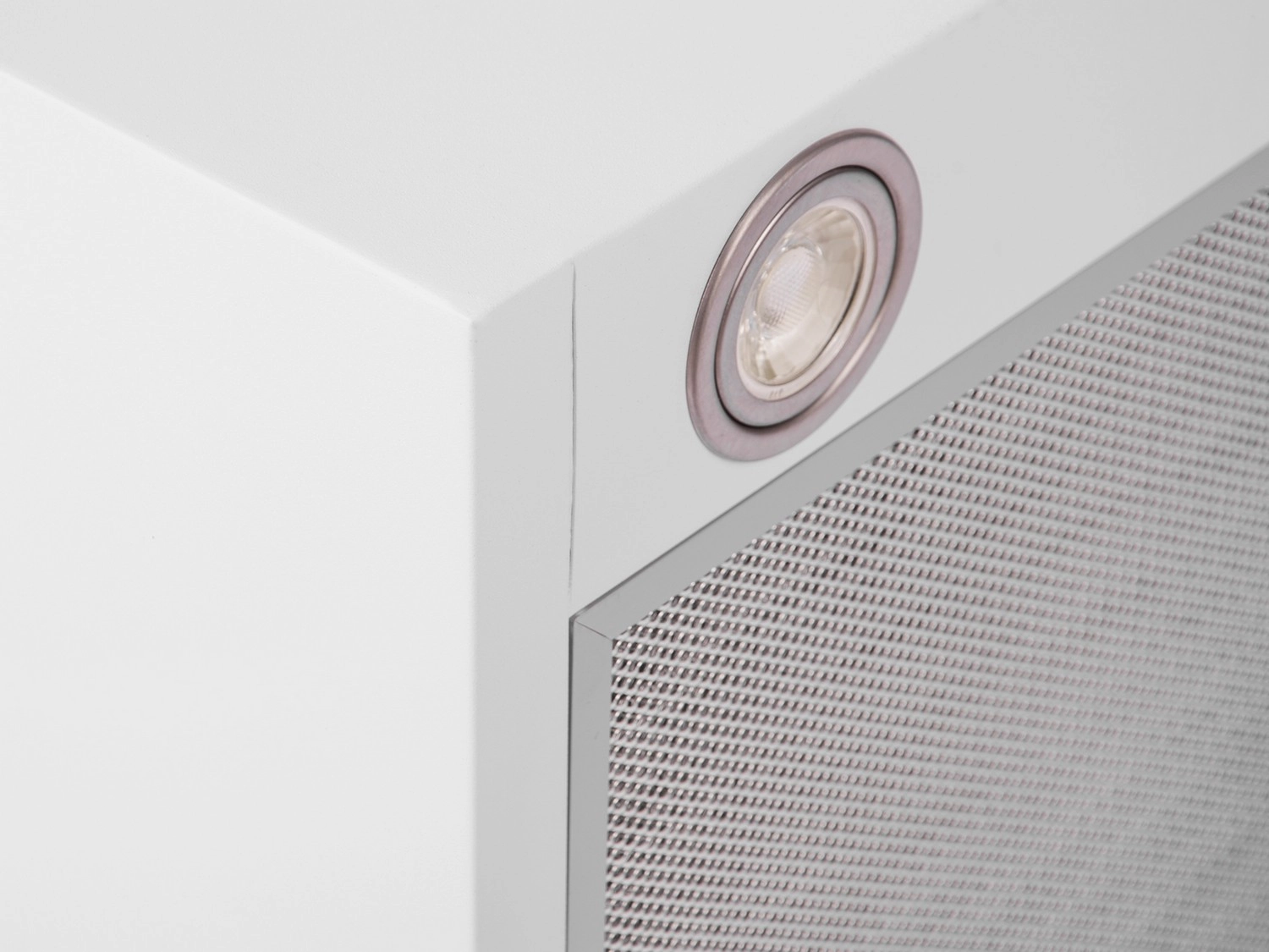 Kompaktno kockasto ohišje iz bele jeklene pločevine, obešeno na jeklenicah, prihrani prostor in elegantno dopolni minimalistične ter odprte kuhinjske zasnove.