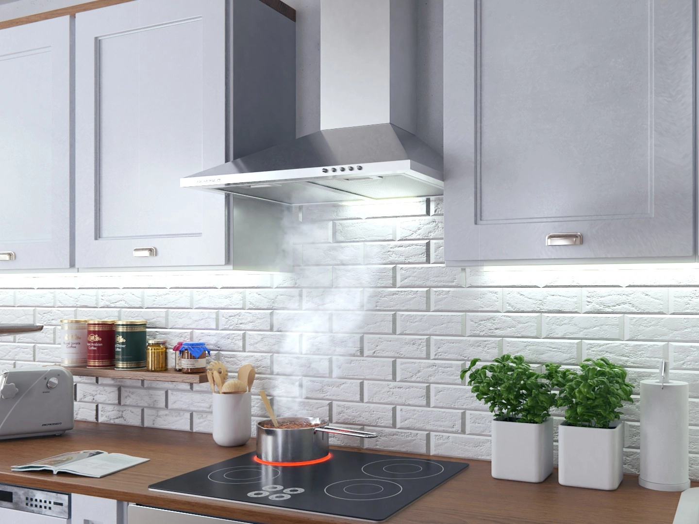- Zmogljivost 350 m³/h – učinkovito odstranjevanje vonjav in pare pri kuhanju.