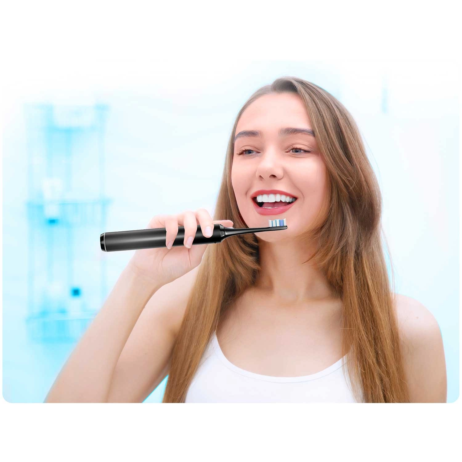Minimalistično ohišje odlično leži v roki, vodoodporna konstrukcija zagotavlja varno uporabo v kopalnici, večconske ščetine pa učinkovito očistijo tudi težje dostopna mesta.