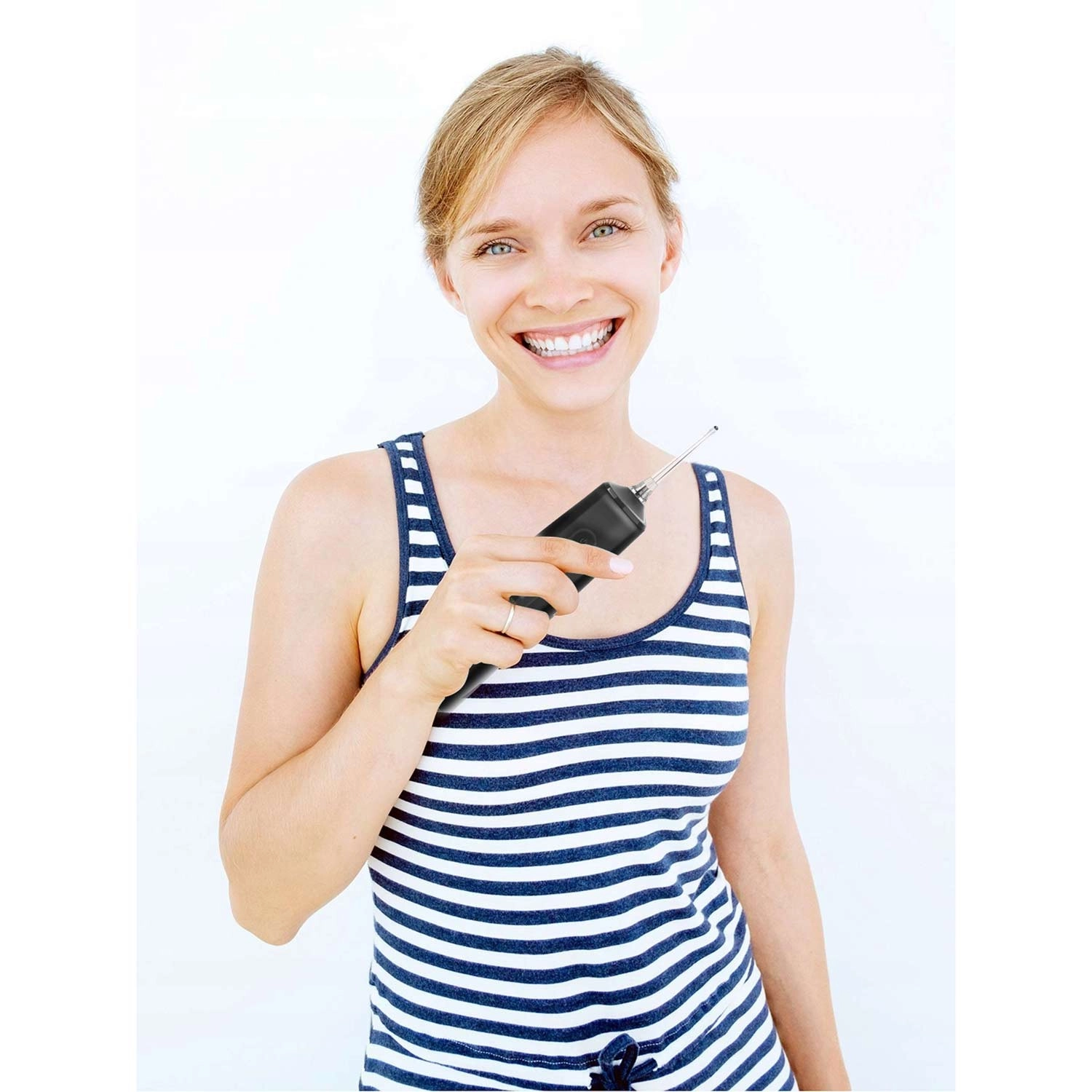 Ozka, rahlo ukrivljena šoba usmerja močan, a nežen vodni curek natančno tja, kjer je potreben – med zobe in ob liniji dlesni. Učinkovito nadomešča zobno nitko.