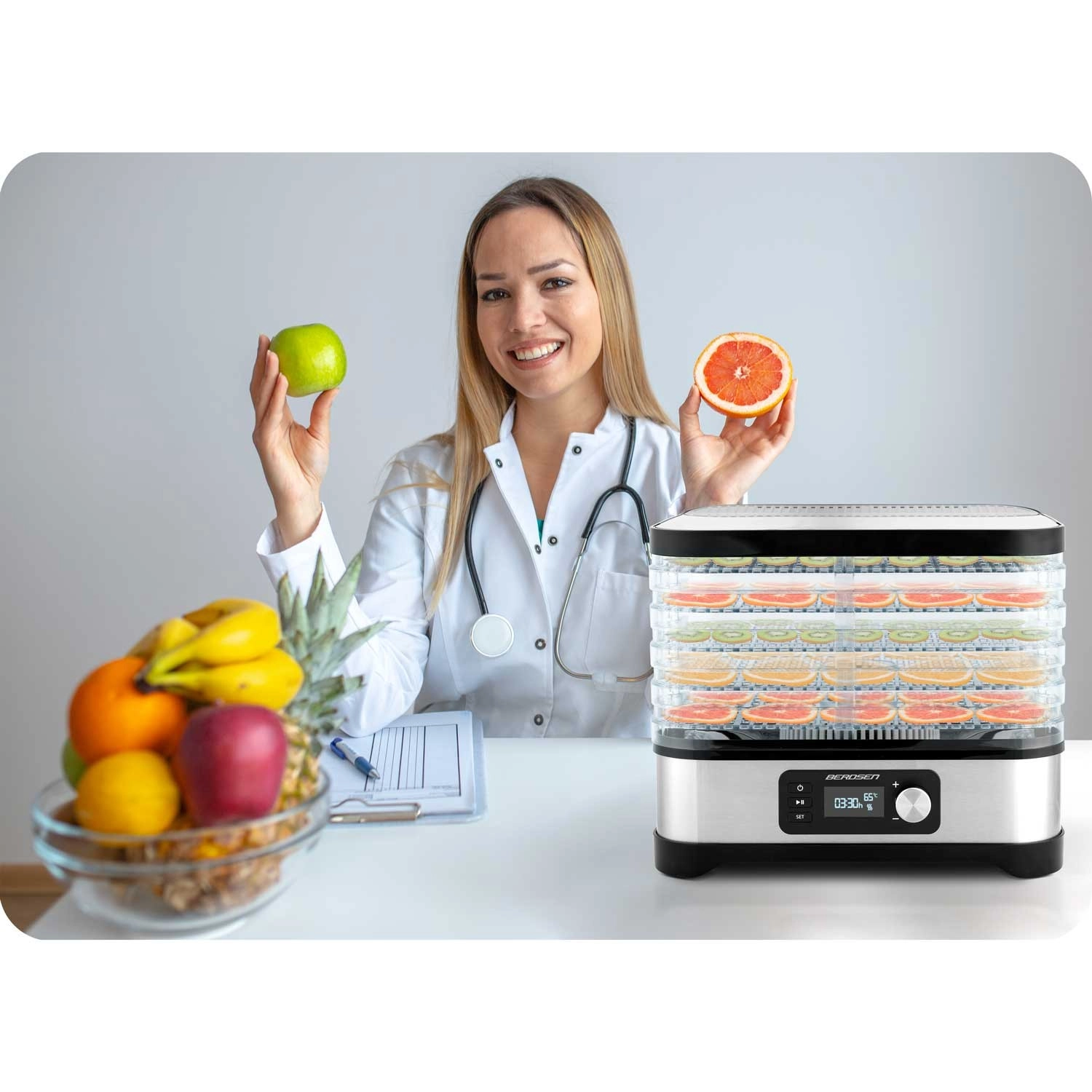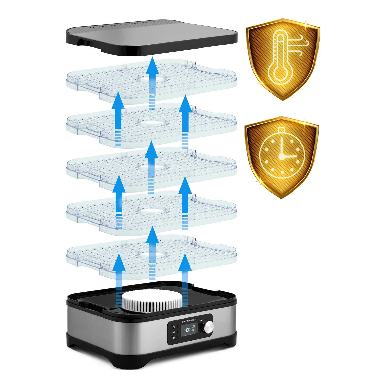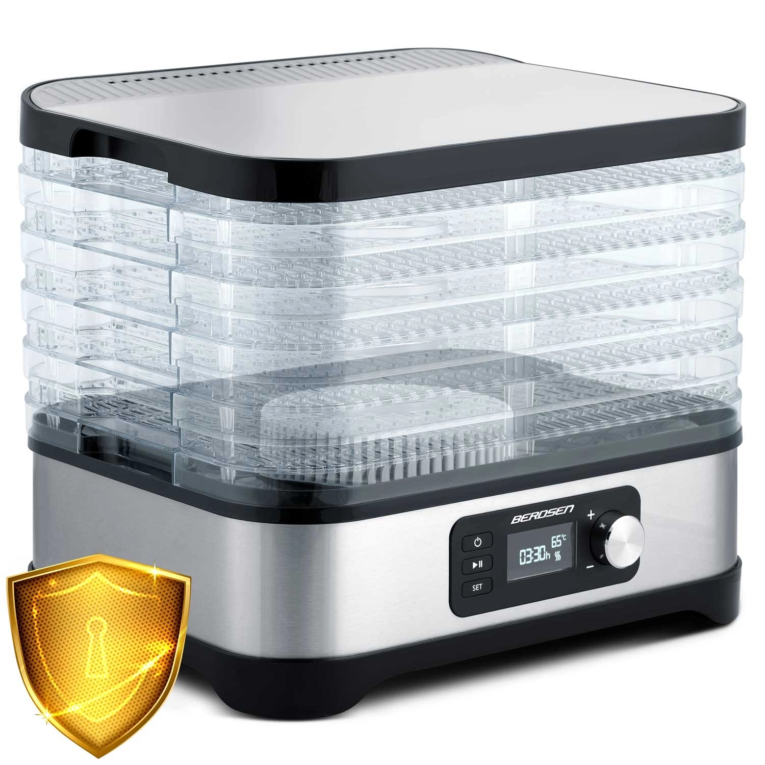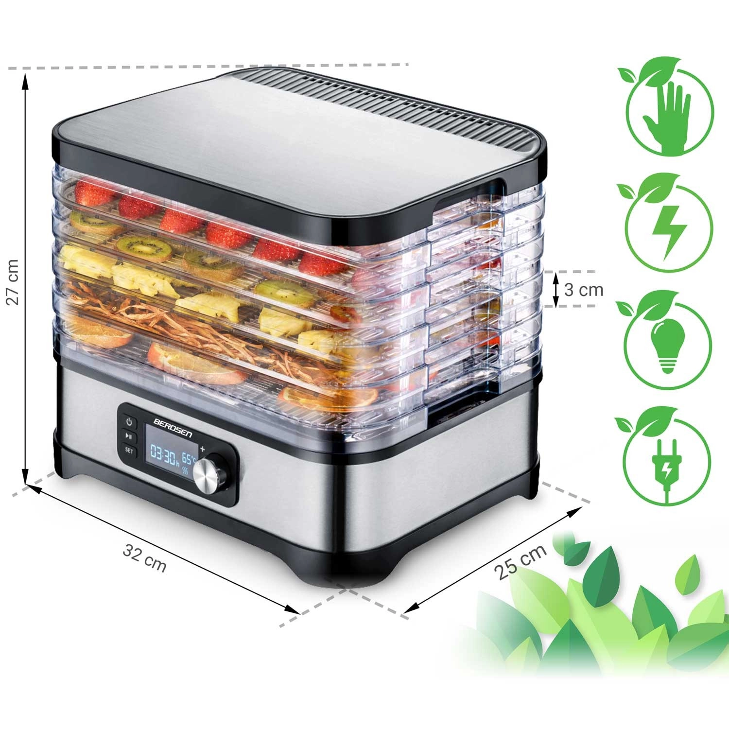Uživajte v zdravih prigrizkih vse leto – sušena jabolka, slive, jagode, zelišča in gobe pripravite natanko po svojem okusu. Sušilnik Berdsen združuje zmogljivo ogrevanje 400 W z natančno elektronsko kontrolo temperature, zato suši nežno in enakomerno. Intuitivna plošča vam omogoča nastavitev časovnika 1–24 ur za brezskrbno delovanje.