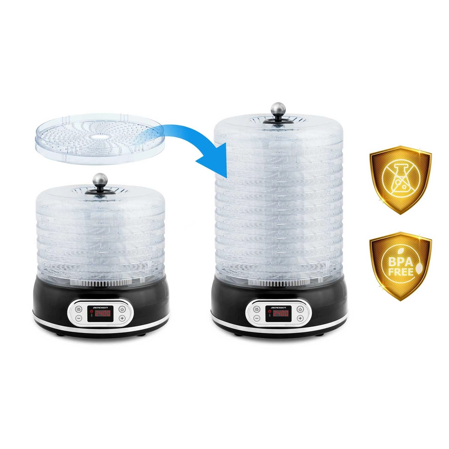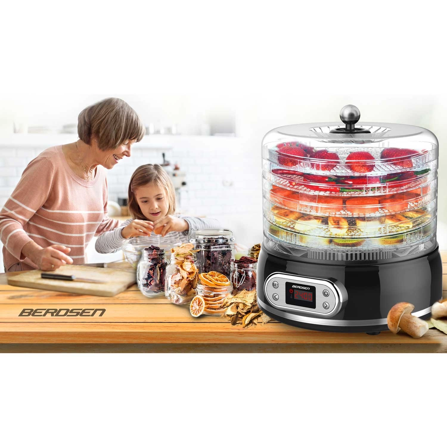 Uživajte v domačem sušenju gob, sadja, zelenjave, zelišč in mesa skozi vse leto. Sušilnik hrane Berdsen ponuja kapaciteto 10 l, 5 prozornih pladnjev, stopenjsko nastavljanje temperature 35–70 °C in digitalni časovnik 1–72 h. Zahvaljujoč termo kroženju suši enakomerno in hitro, ima zaščito pred pregrevanjem ter izpolnjuje varnostni certifikaciji CE in RoHS.