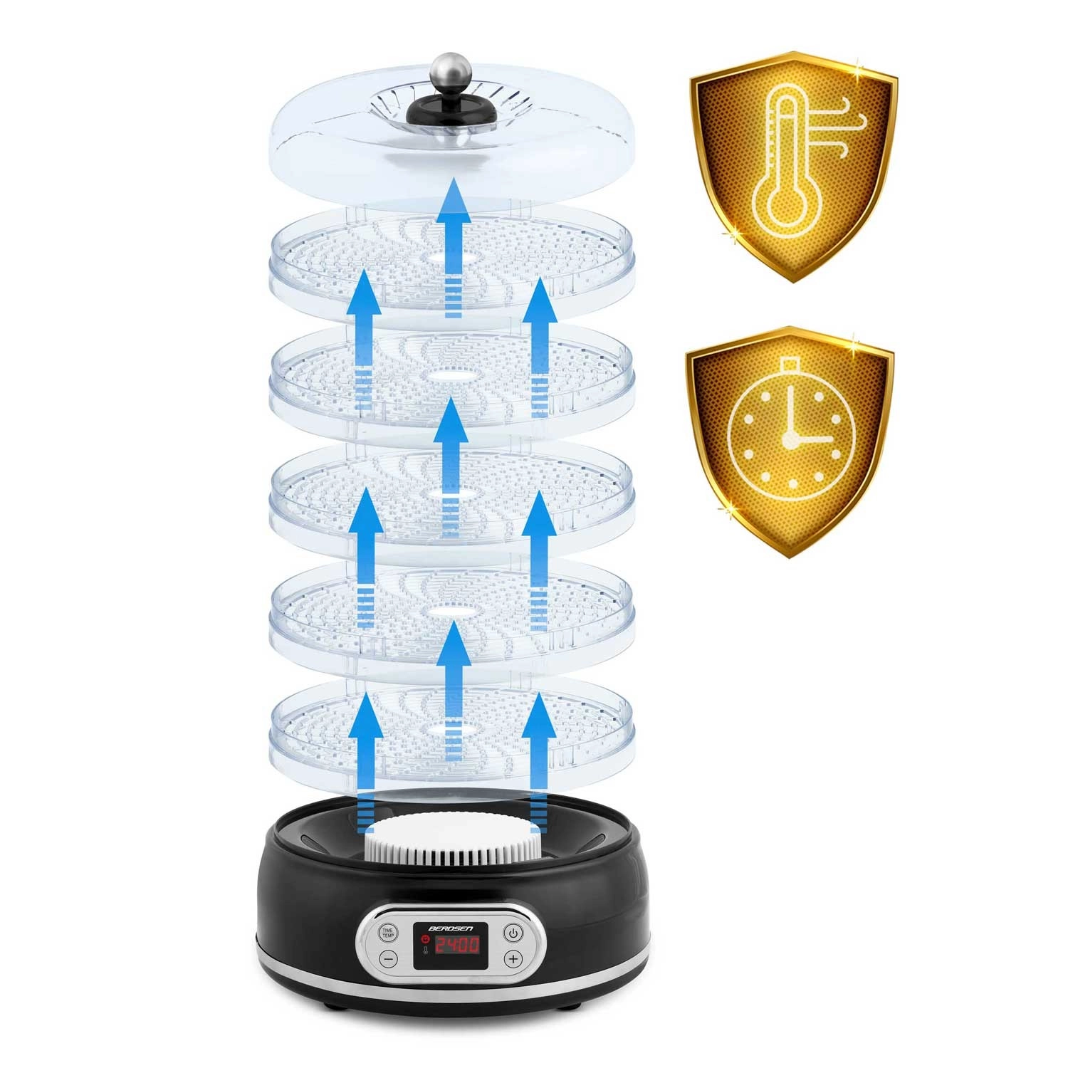 Vgrajen ventilator kroži topel zrak po vseh nivojih, zato sadje, zelenjava in zelišča sušijo enakomerno brez potrebe po pogostem prelaganju.