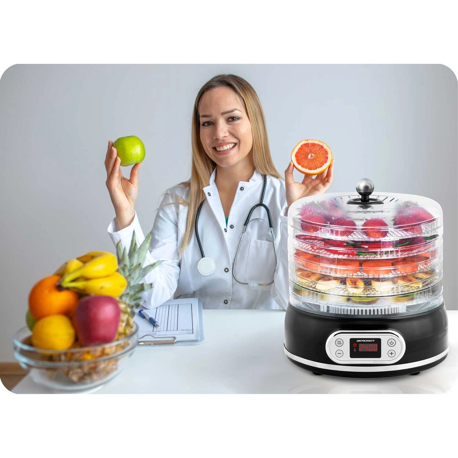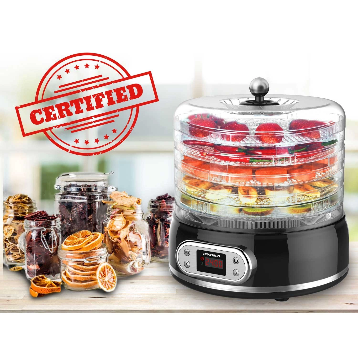 Ustvarjajte zdrave in okusne priboljške – od hrustljavih jabolčnih kolobarjev do posušenih zelišč in domačega jerkyja. Sušilnik Berdsen z elektronskim upravljanjem in berljivim zaslonom zagotavlja natančno nastavitev časa in temperature. Termo kroženje omogoča enakomeren pretok toplega zraka, zato rezine sušite učinkovito brez prepeke.