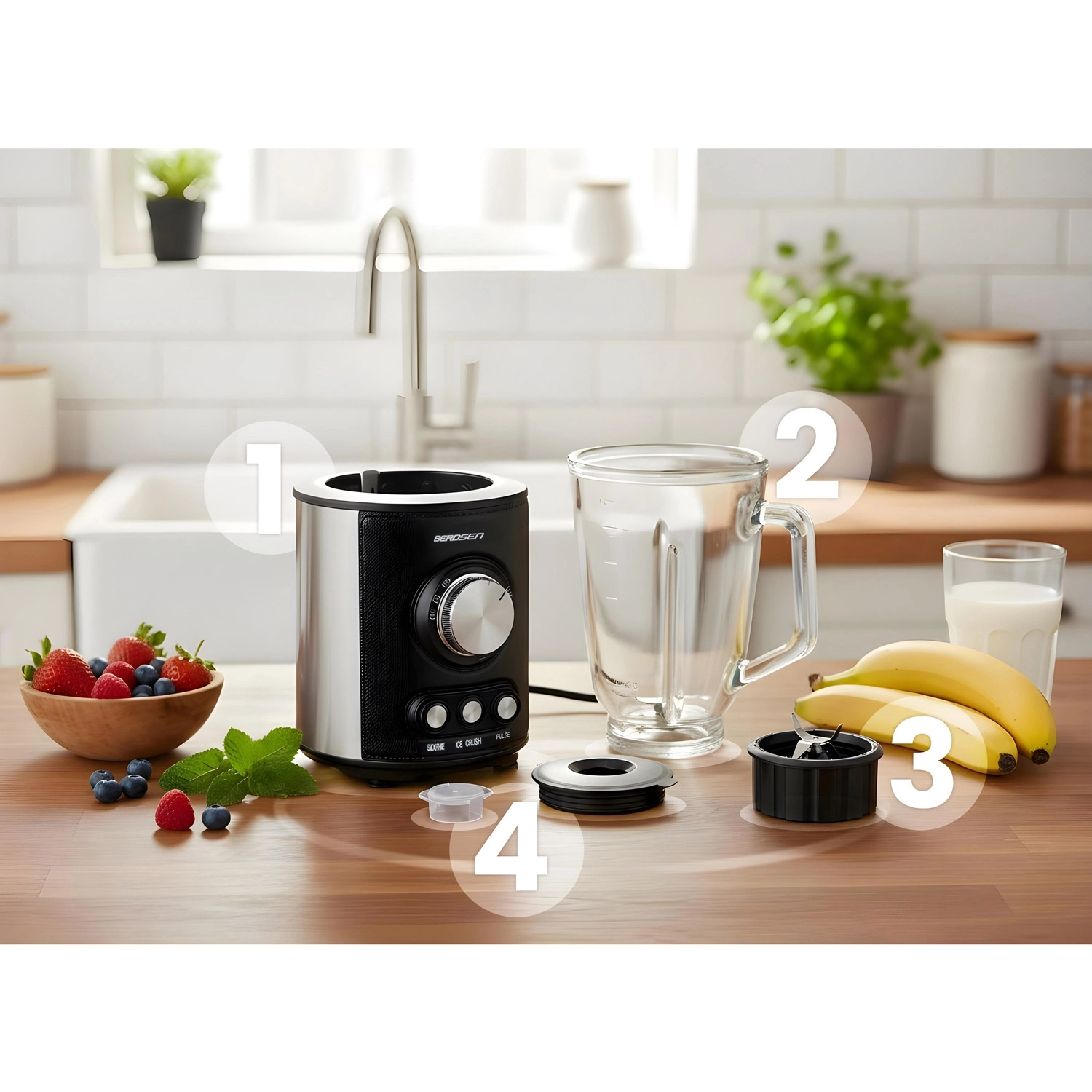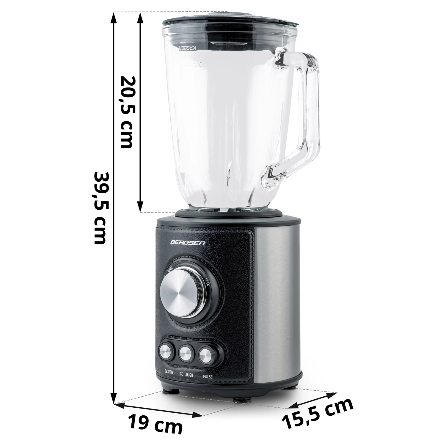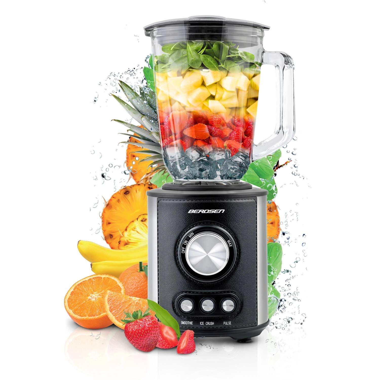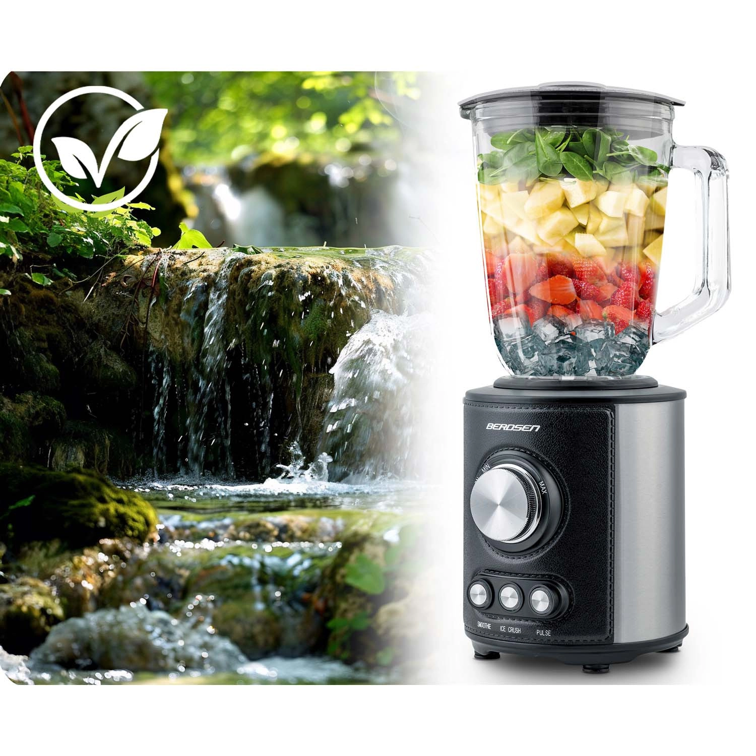 Zmogljiv namizni mešalnik BERDSEN s prostornino 1,5 l in motorjem 800 W zlahka pripravi smoothieje, juhe in drobi led. Ima steklen vrč, nerjaveče rezila in 3 samodejne programe – Smoothie, Ice Crush in Pulse. Navdušili vas bodo osvetljeni upravljalni elementi, protizdrsne nogice, enostavno čiščenje ter varnostni zaščiti proti pregrevanju in nepravilni sestavi.