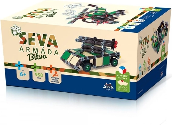 Gradbeni set SEVA Vojska – bitka prinaša otrokom neskončne možnosti ustvarjanja in igre. Z 958 skrbno izdelanimi kosi lahko gradijo realistična vojaška vozila in domiselne konstrukcije. Češka kakovost, varni materiali brez ftalatov in preverjena izdelava zagotavljajo dolgo življenjsko dobo in varno igro.
