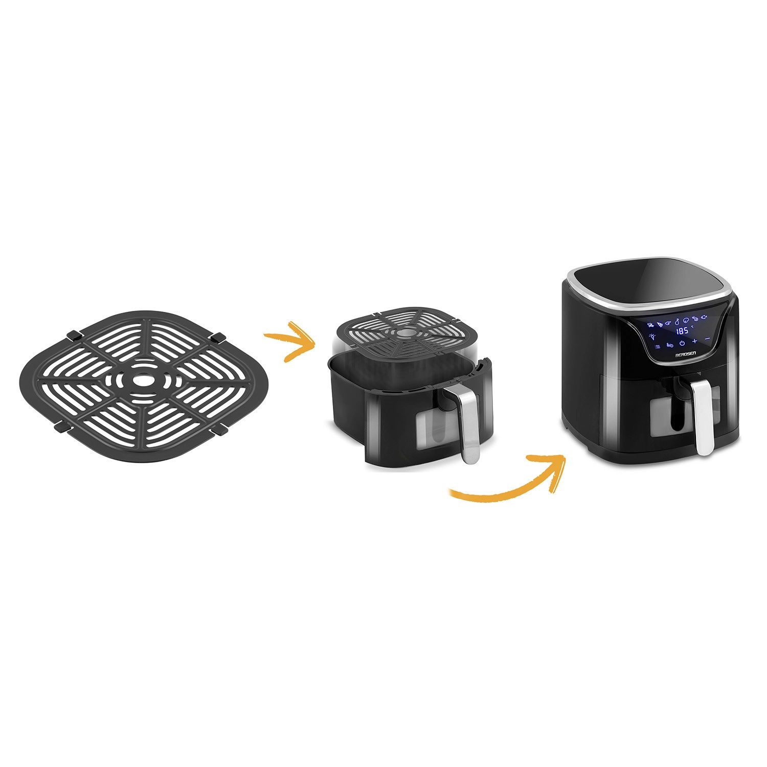 Izboljšajte svoj cvrtnik na vroči zrak z vzdržljivo rešetko velikosti 21 × 21 cm. Zahvaljujoč nelepljivi PTFE površini se jedi ne prijemajo, zlahka jih postrežete, čiščenje pa je hitro in preprosto. Kakovostno nerjaveče jeklo zagotavlja dolgo življenjsko dobo in stabilnost pri vsakodnevni uporabi.