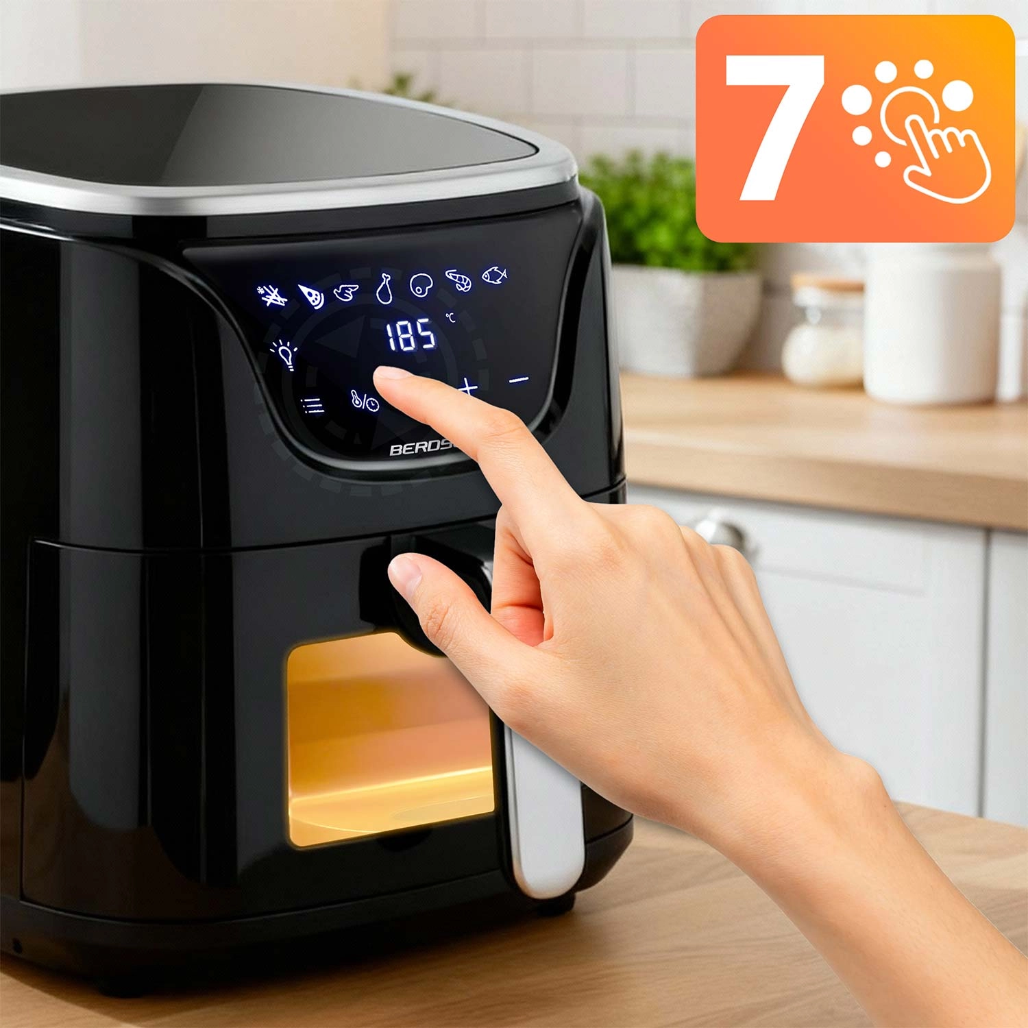 Intuitivno upravljanje na dotik z jasnimi ikonami, temperaturo do 200 °C in časovnikom 0–60 min. Prosojno okence z osvetlitvijo omogoča spremljanje jedi brez odpiranja koša.