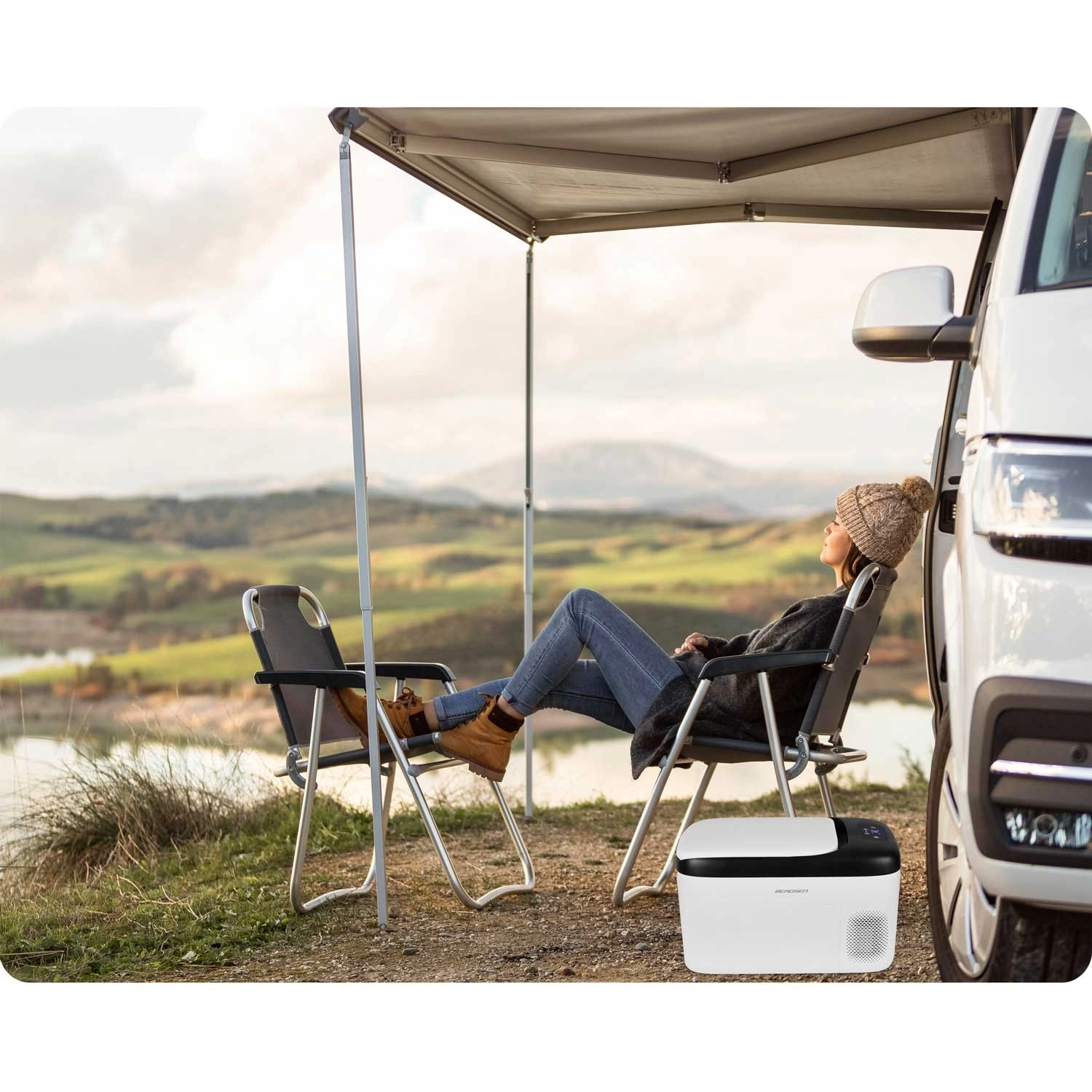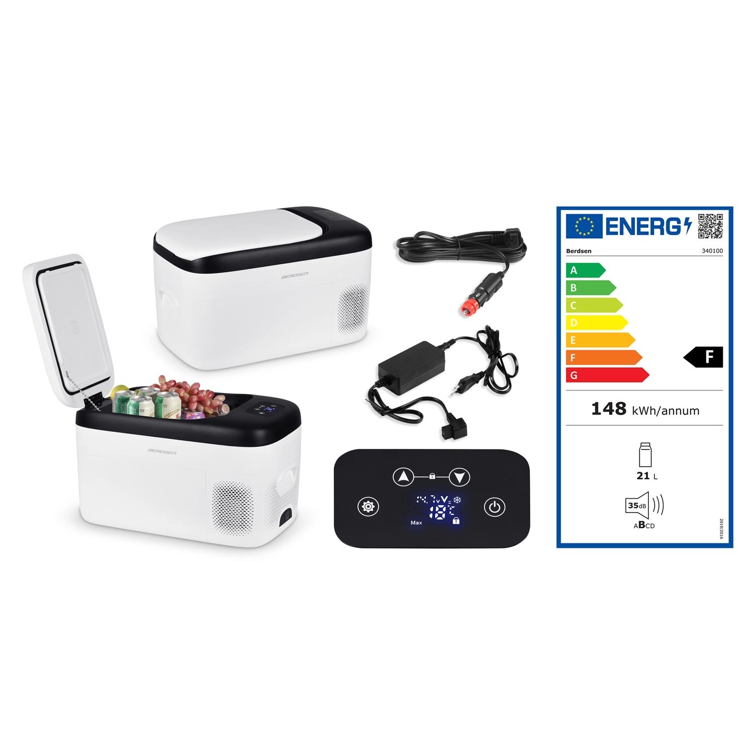 Kompakten kompresorski avtohladilnik BERDSEN Icemax 401 s prostornino 21 l je idealen za plažo, kampiranje in avtodom. Ponuja hlajenje in ogrevanje v razponu -20 °C do +20 °C, dva načina ECO/MAX, tihi način delovanja do 45 dB ter digitalno upravljanje na dotik z zaklepom Child Lock. Napajate ga iz 12/24 V v vozilu ali iz 100–240 V v omrežju, vključno z zaščito baterije in kakovostno izolacijo za stalno temperaturo.