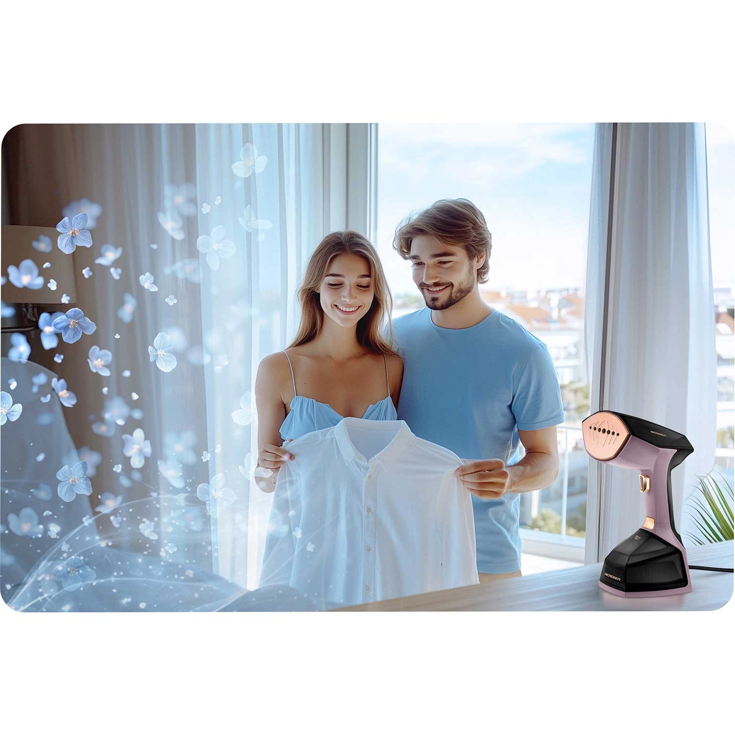 BERDSEN BD-300 je kompaktni in stilski parni likalnik (steamer), ki hitro in nežno zgladi gube na oblačilih, zavesah in oblazinjenju – brez likalne deske. Zahvaljujoč 2000 W in pretoku 45 g/min para prodre globoko v vlakna, odstranjuje vonjave ter pomaga odpravljati bakterije in pršice. LCD-zaslon olajša nadzor nastavitev in nivoja vode, 3 stopnje pare pa prilagodijo moč različnim tkaninam.