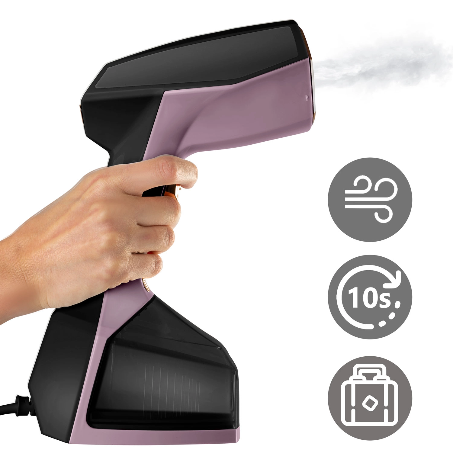 Moč 2000 W in neprekinjen izpust pare 45 g/min hitro in učinkovito zgladita tudi trdovratne gube. Pripravljen za uporabo v 10 sekundah.