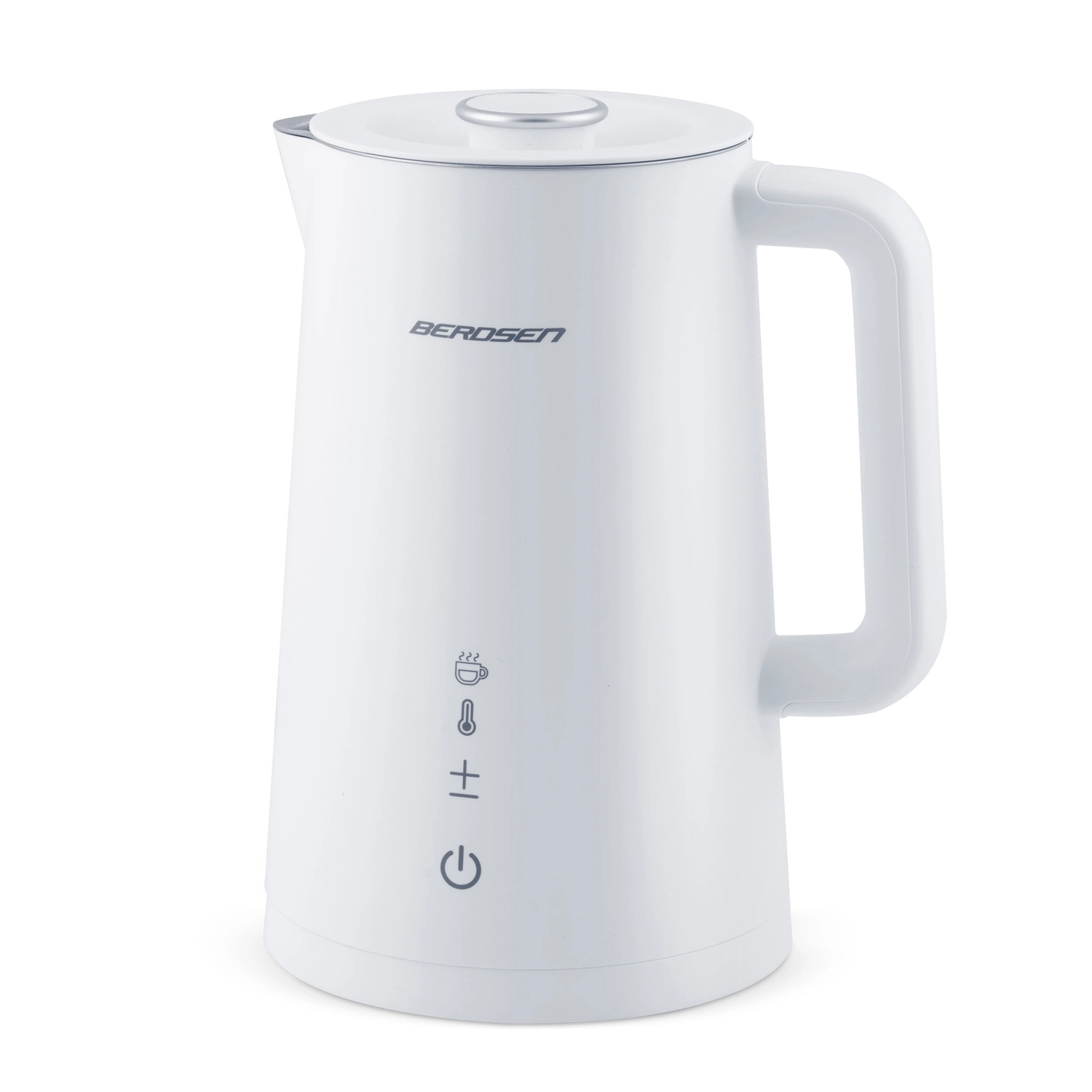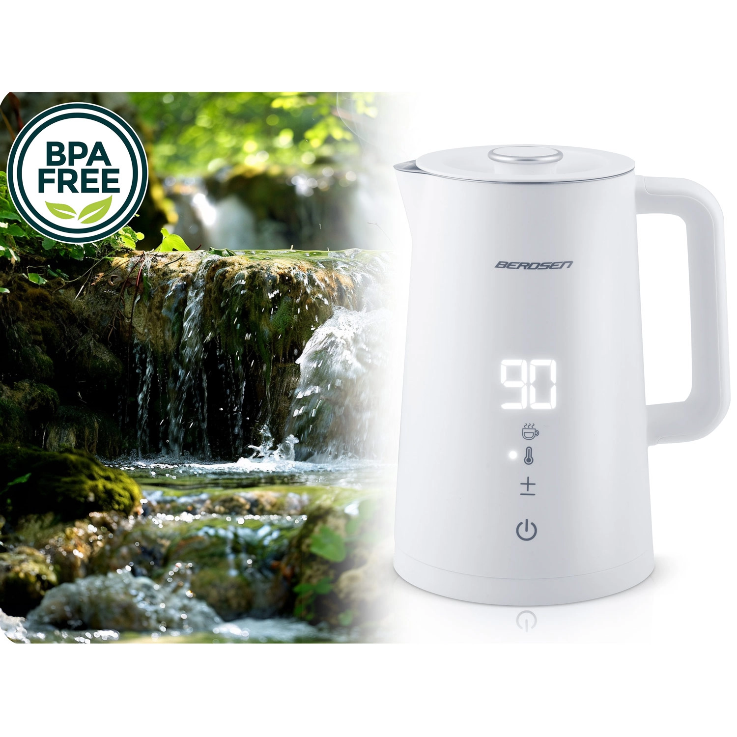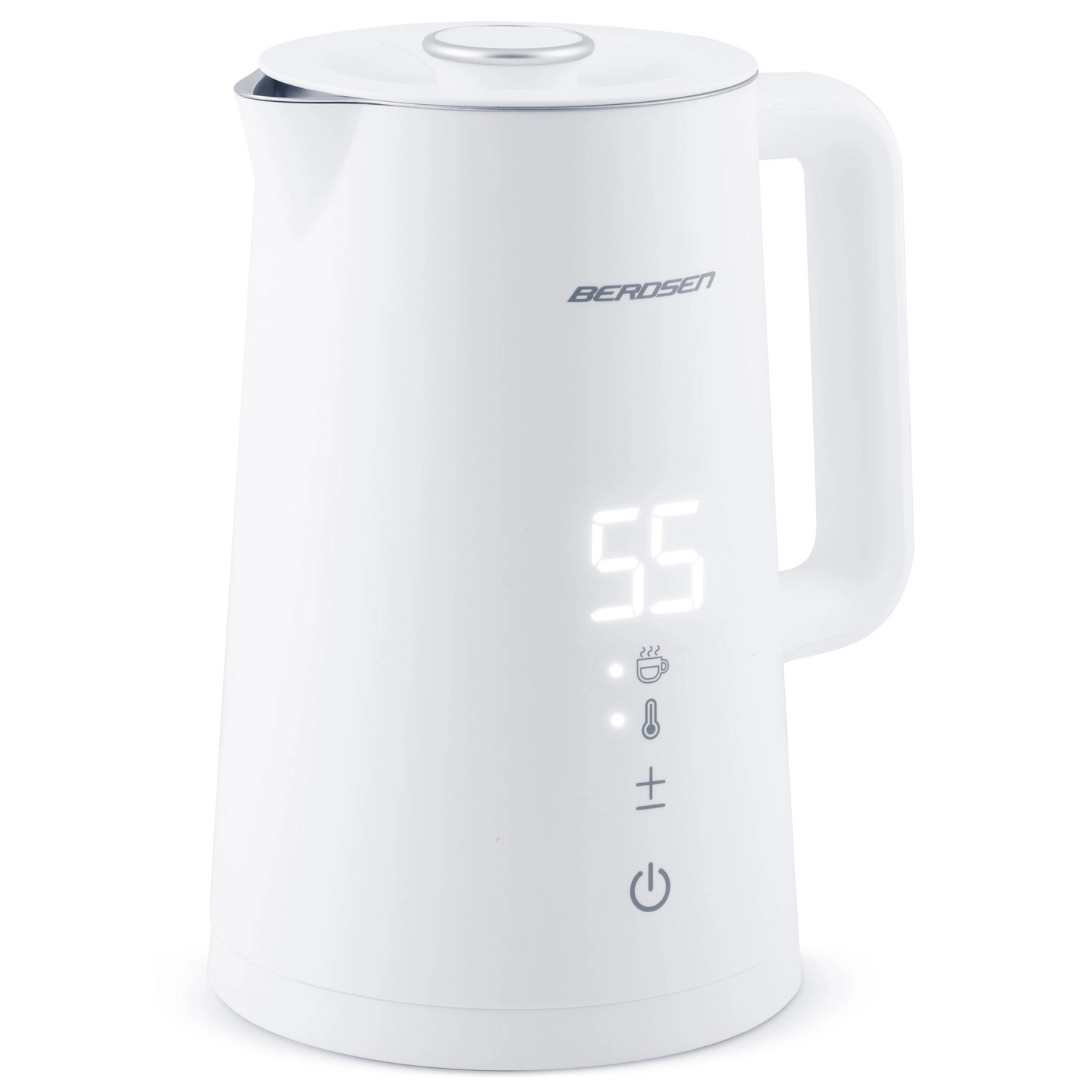 Elegantni električni grelnik BERDSEN s prostornino 1,7 l ponuja natančno nastavitev temperature v 5 stopnjah, na dotik občutljiv panel z LED-zaslonom, funkcijo ohranjanja toplote do 2 uri in varno dvojno stensko zasnovo CoolTouch. Notranjost iz nerjavnega jekla SUS 304 zagotavlja čist okus vode in dolgo življenjsko dobo.