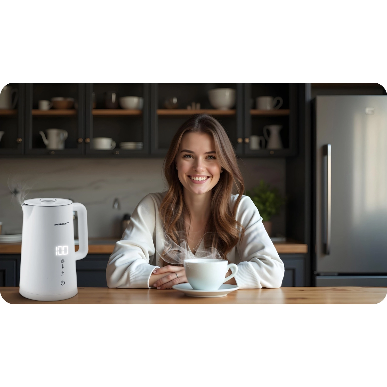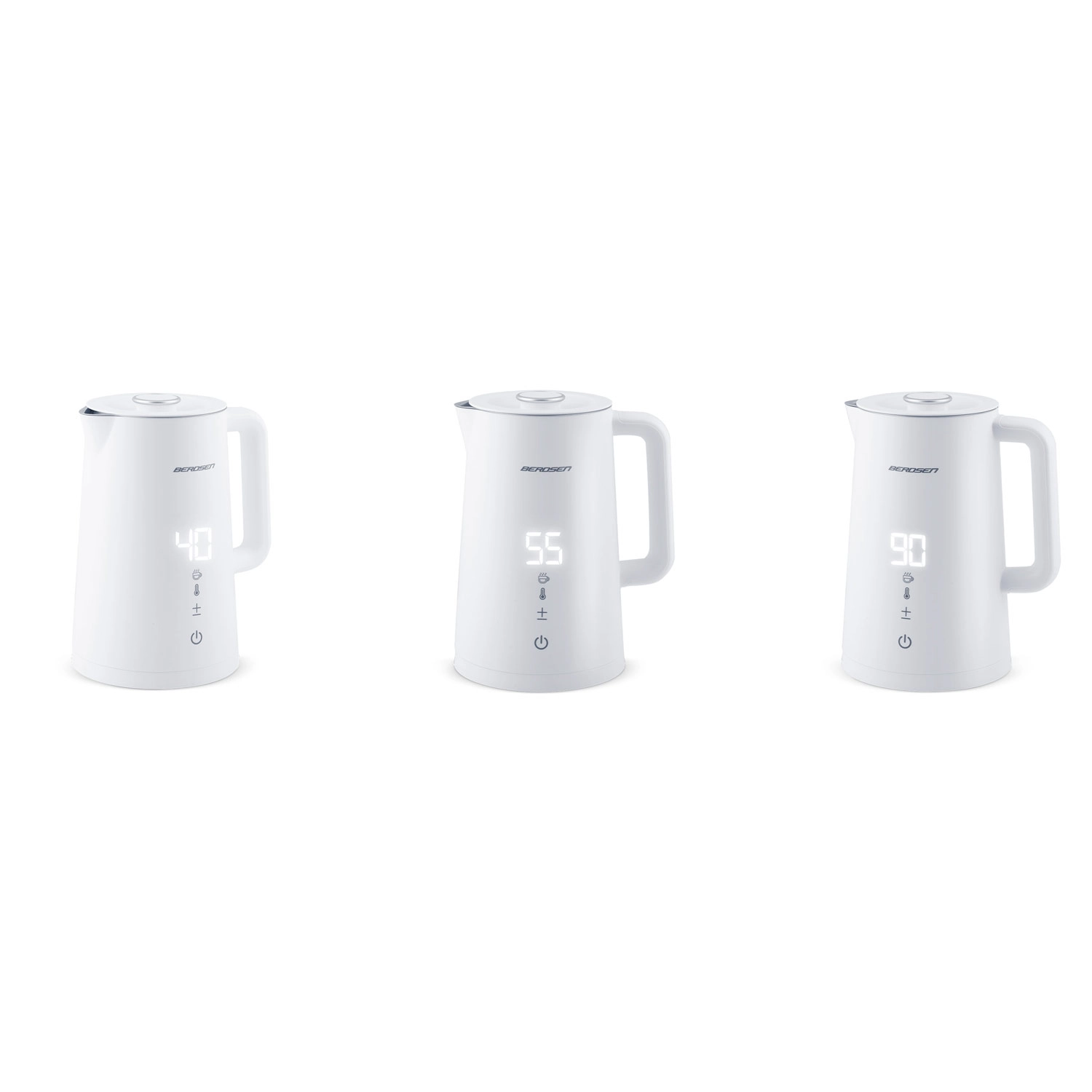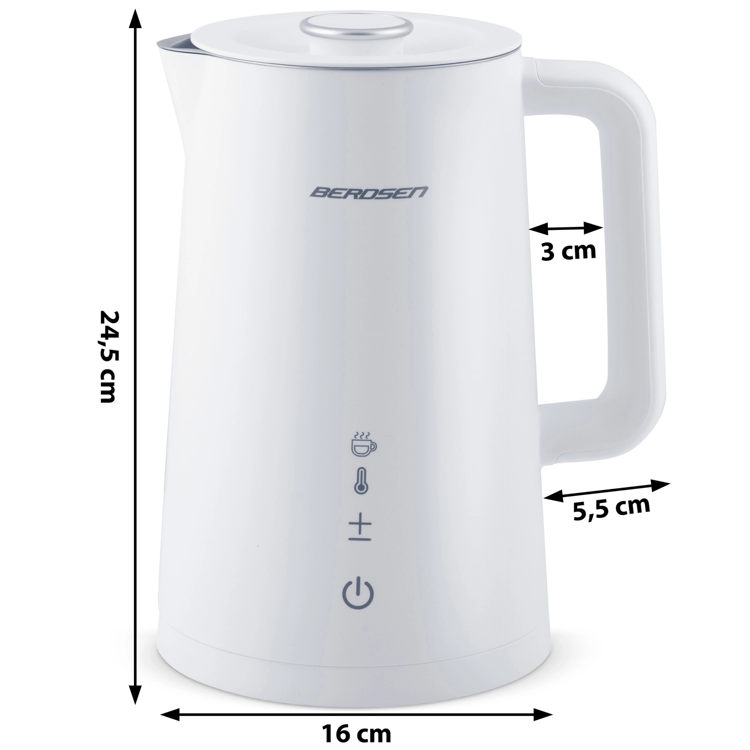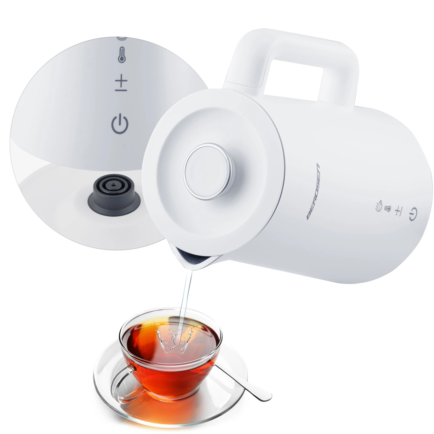 Elegantni električni grelnik BERDSEN s prostornino 1,7 l ponuja natančno nastavitev temperature v 5 stopnjah, na dotik občutljiv panel z LED-zaslonom, funkcijo ohranjanja toplote do 2 uri in varno dvojno stensko zasnovo CoolTouch. Notranjost iz nerjavnega jekla SUS 304 zagotavlja čist okus vode in dolgo življenjsko dobo.