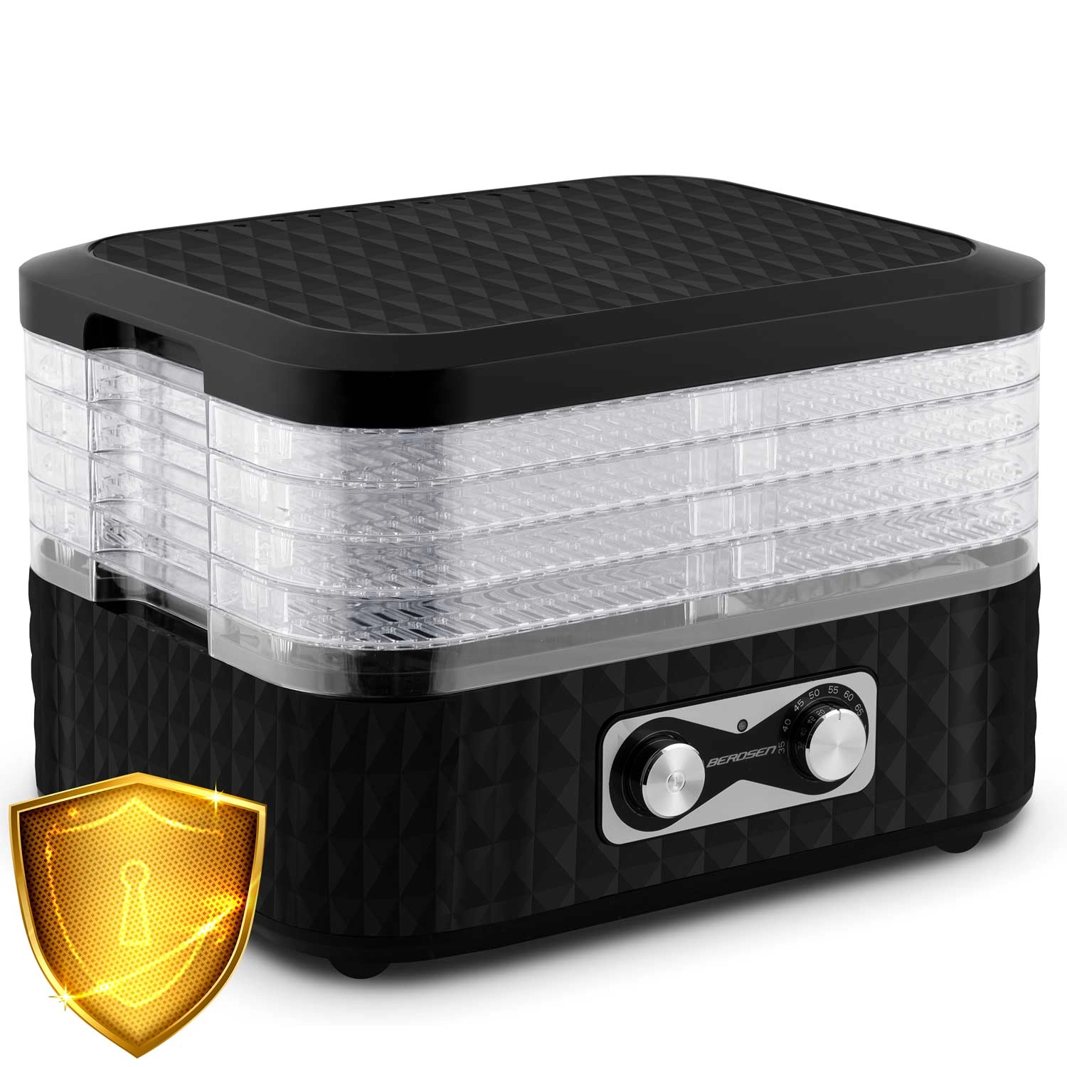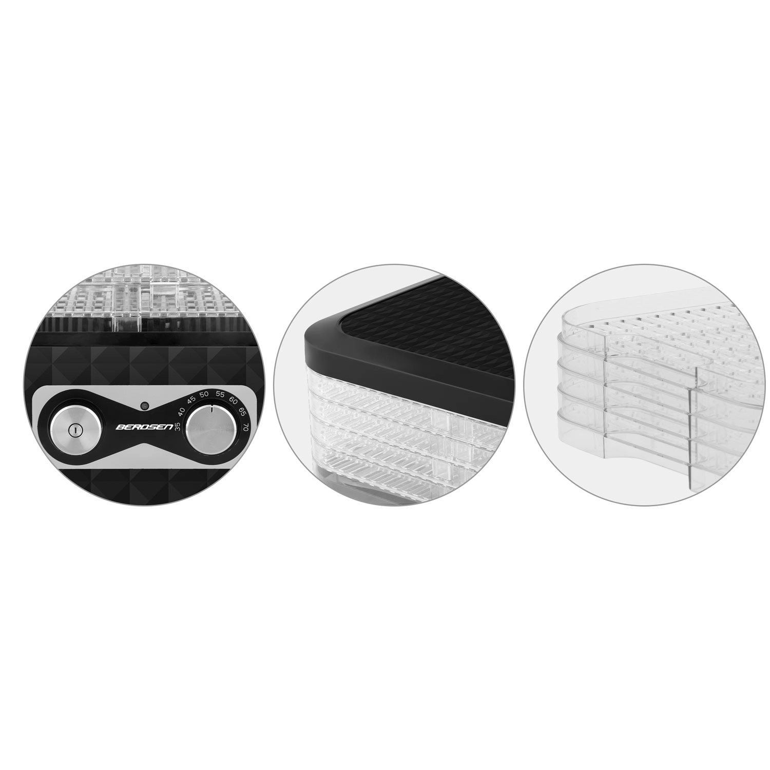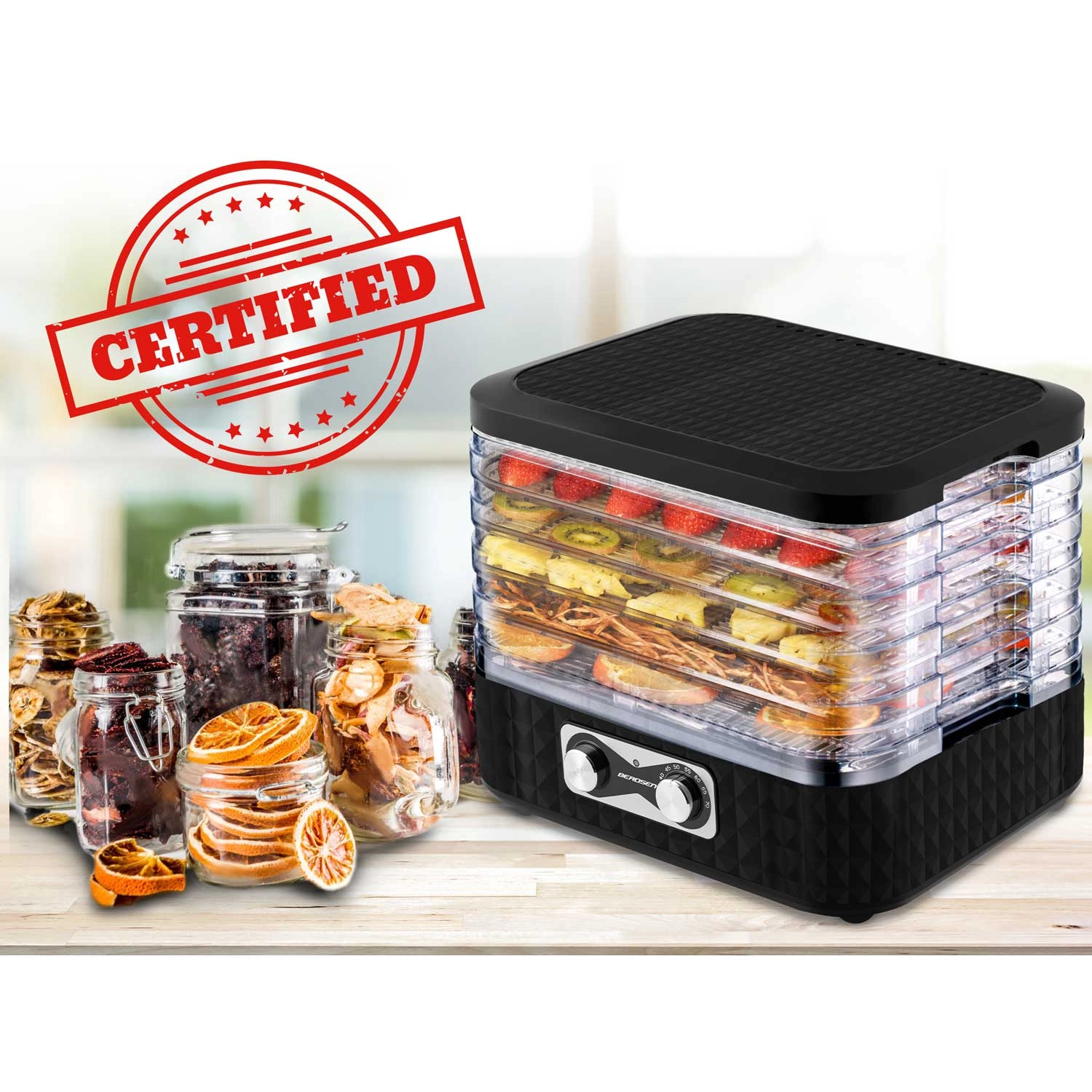 Z nastavitvijo temperature v območju 35–70 °C sušenje prilagodite posameznim živilom – od nežnega sušenja zelišč do intenzivnejšega sušenja zelenjave in mesa. Varen način delovanja podpirajo certifikata CE in RoHS ter vgrajeni toplotno-varnostni elementi.