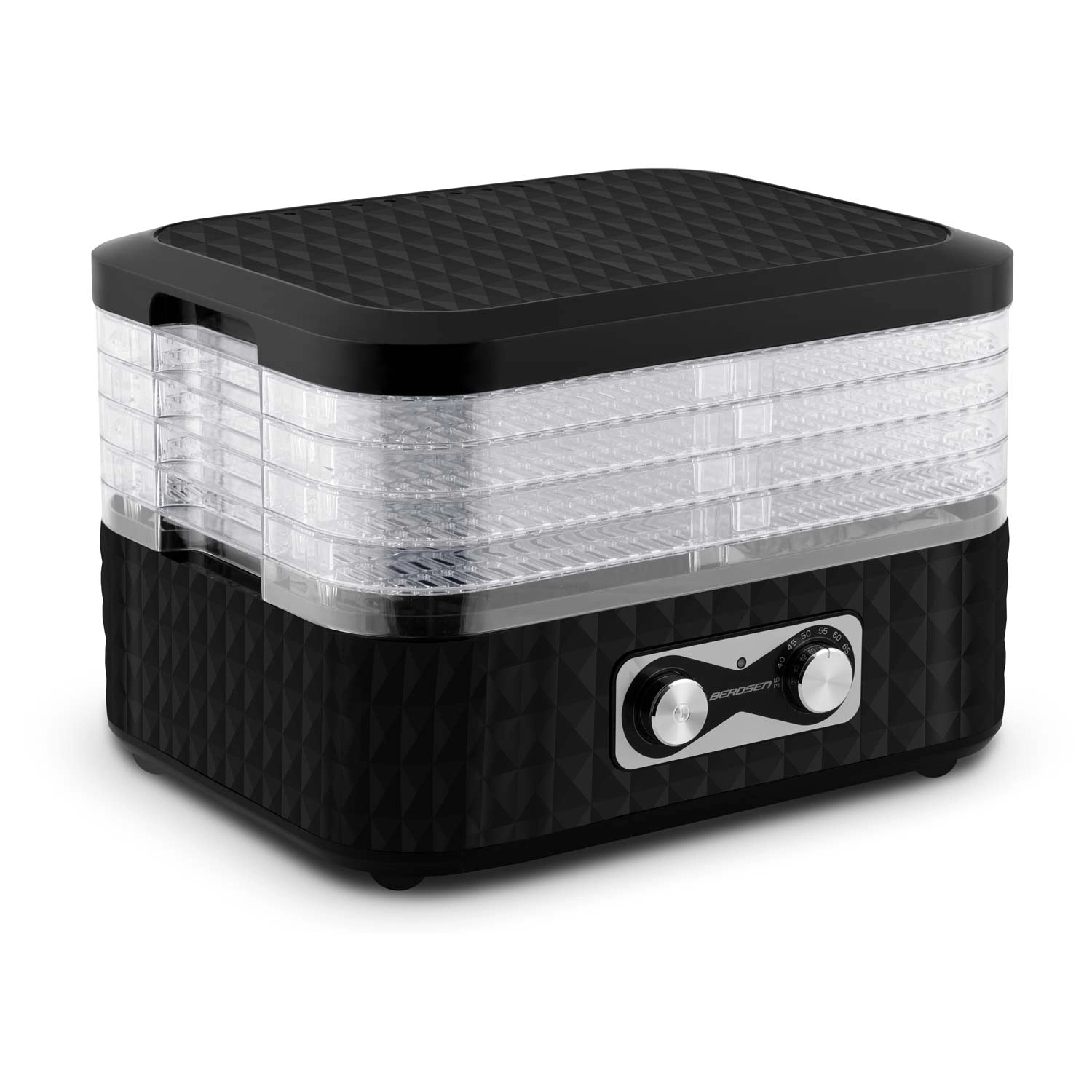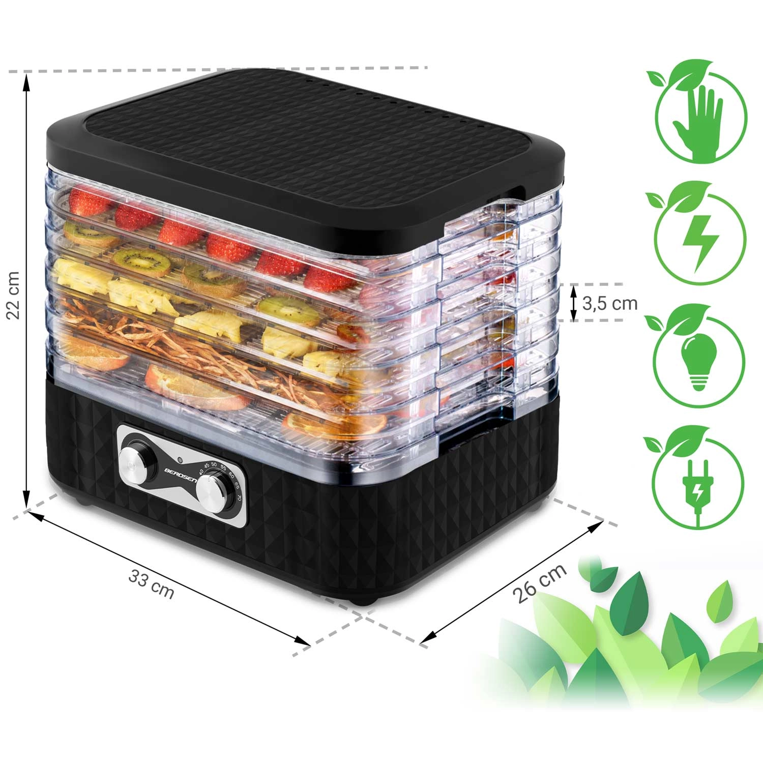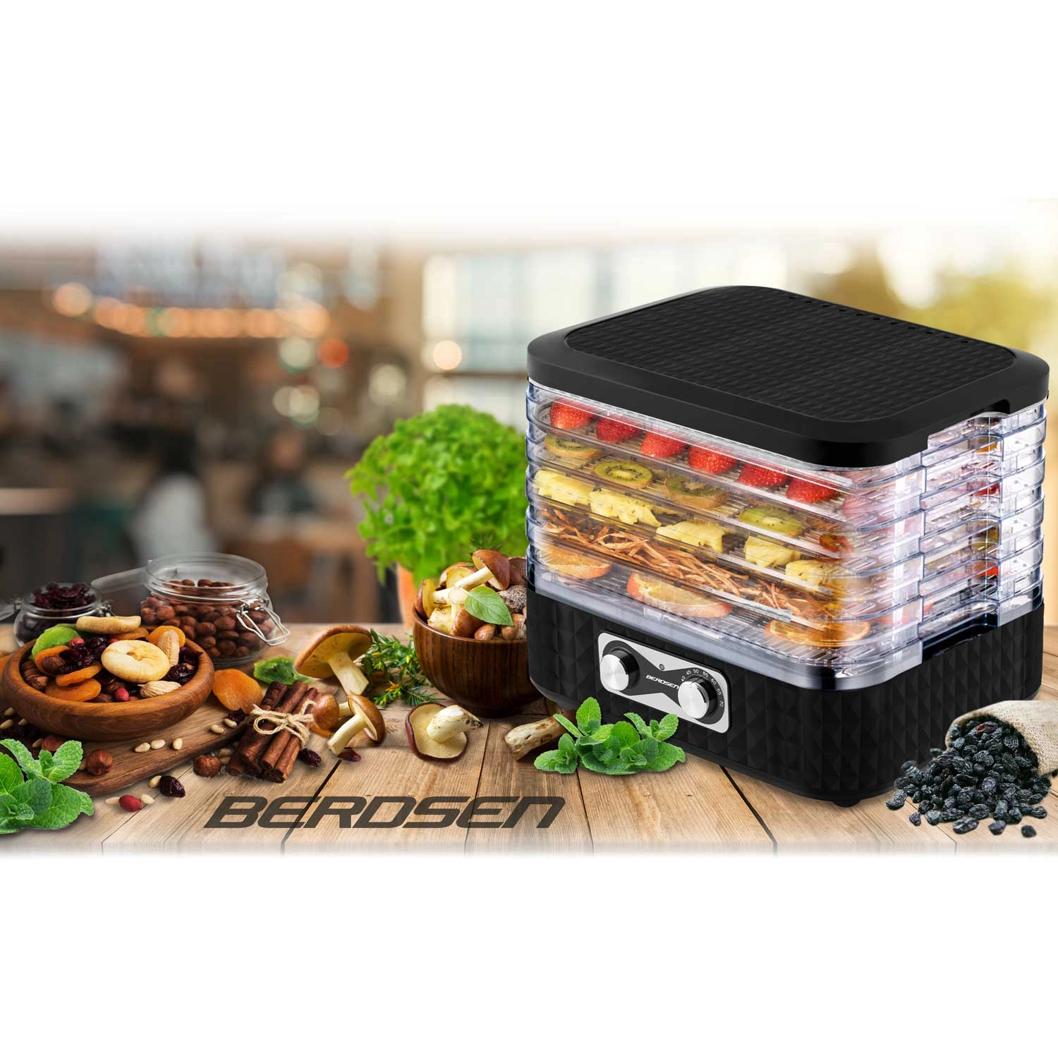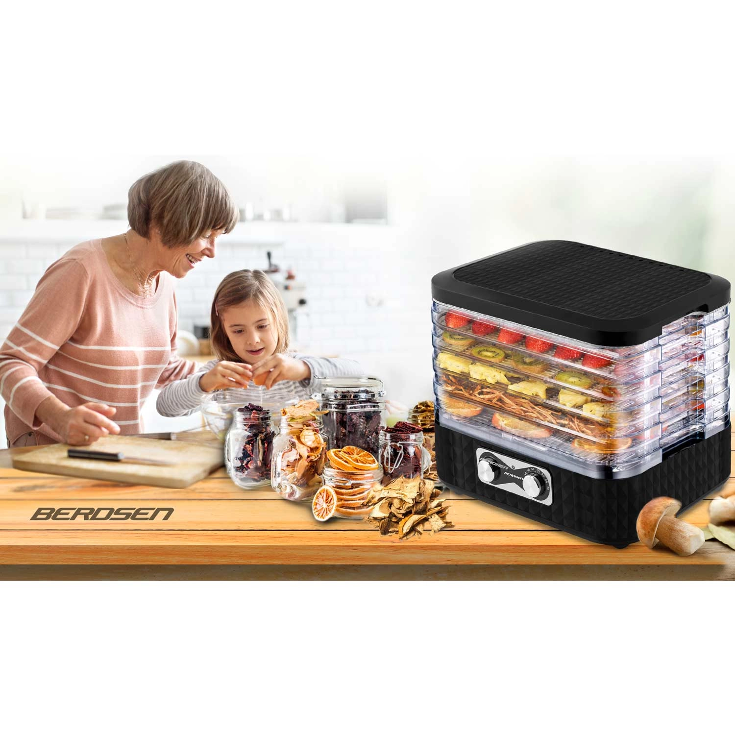 Pripravite si zalogo za celo sezono. Sušilnik BERDSEN z enostavnim upravljanjem in prozornimi pladnji zagotavlja enakomerno sušenje brez prismoditev. Pet finih mrež preprečuje izpadanje drobnih koščkov, zato brez skrbi posušite zelišča, gozdne gobe ter rezine jagod ali jabolk.