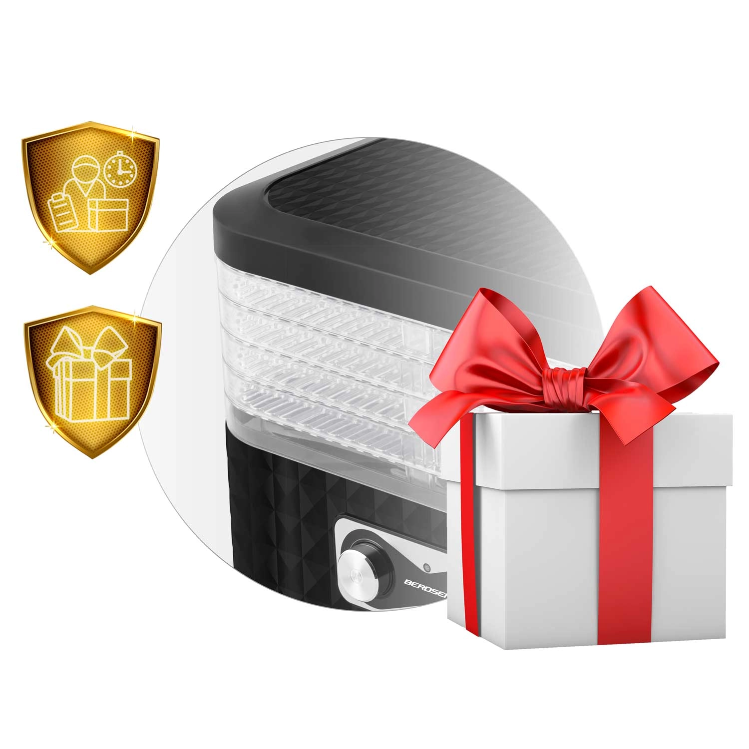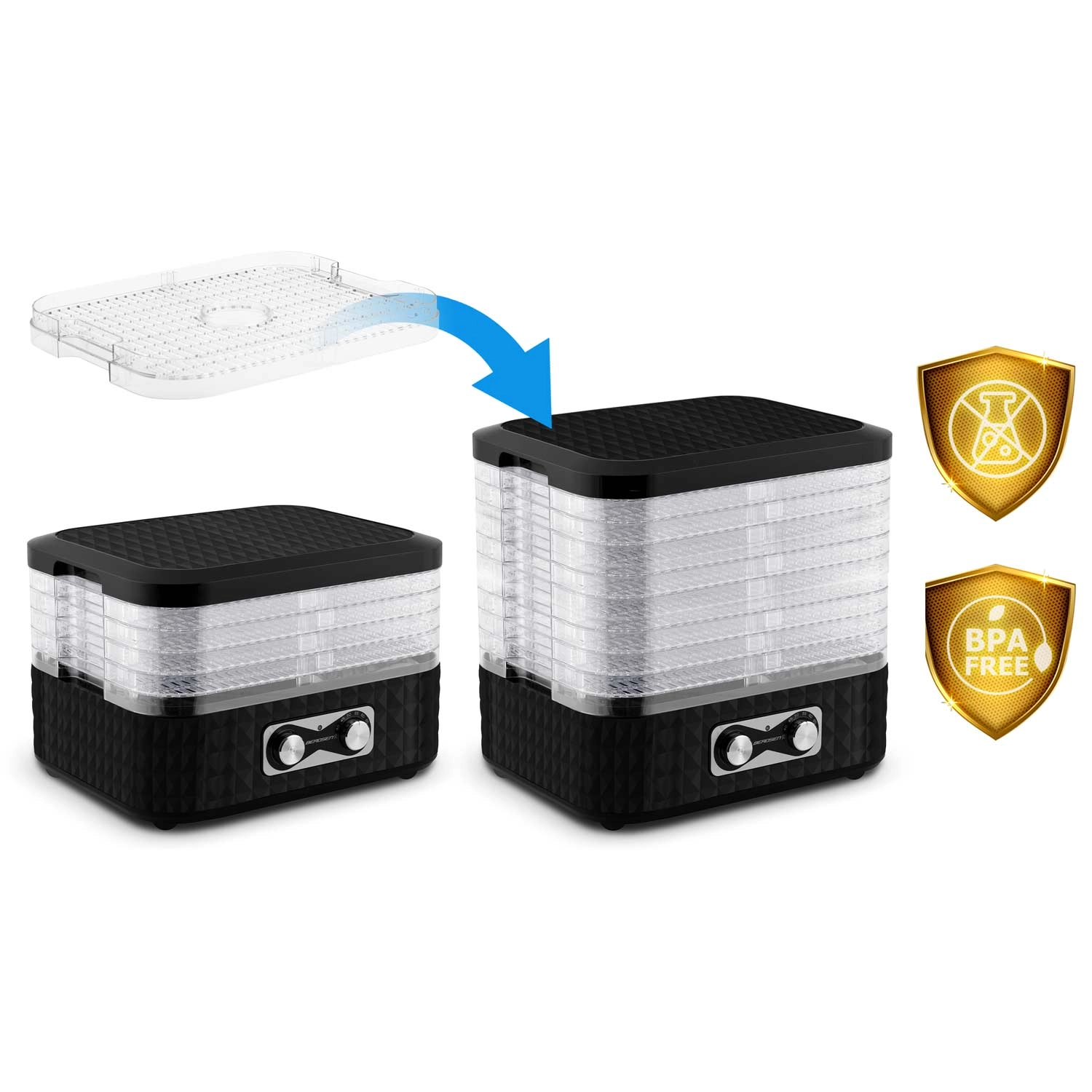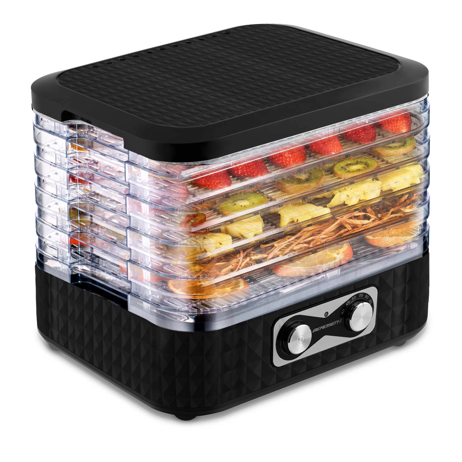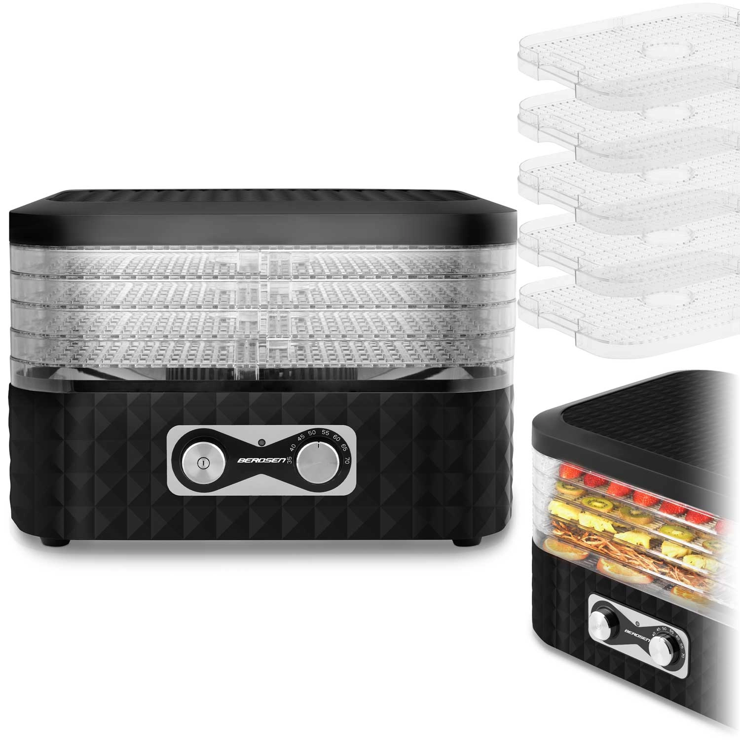 Pripravite si zalogo za celo sezono. Sušilnik BERDSEN z enostavnim upravljanjem in prozornimi pladnji zagotavlja enakomerno sušenje brez prismoditev. Pet finih mrež preprečuje izpadanje drobnih koščkov, zato brez skrbi posušite zelišča, gozdne gobe ter rezine jagod ali jabolk.