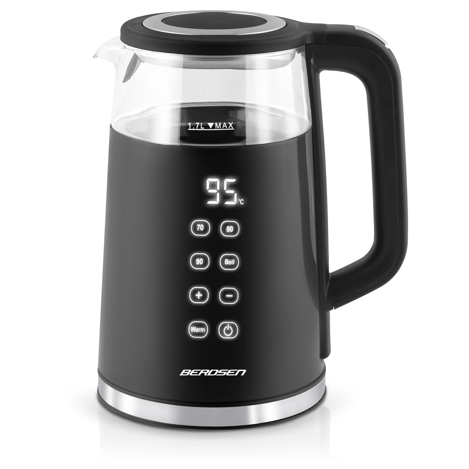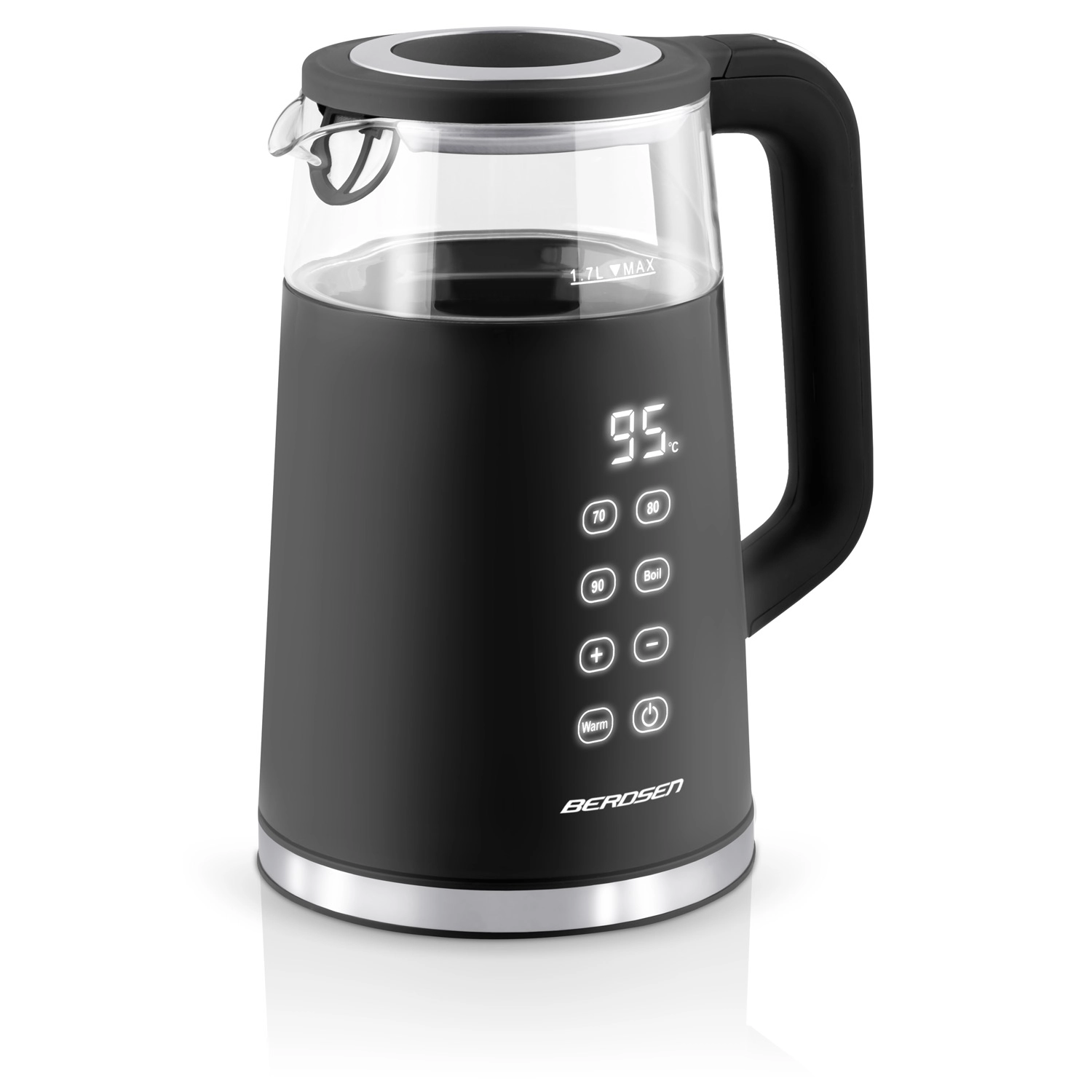Uživajte v popolnem nadzoru nad pripravo čaja in kave. Grelnik BERDSEN ponuja upravljanje na dotik z jasnim zaslonom, izbiro štirih temperatur za različne napitke in funkcijo Warm za udobno ohranjanje toplote do 2 uri. Zahvaljujoč kombinaciji kaljenega stekla in nerjavnega jekla SUS 304 je voda čista in brez neželenih vonjav.