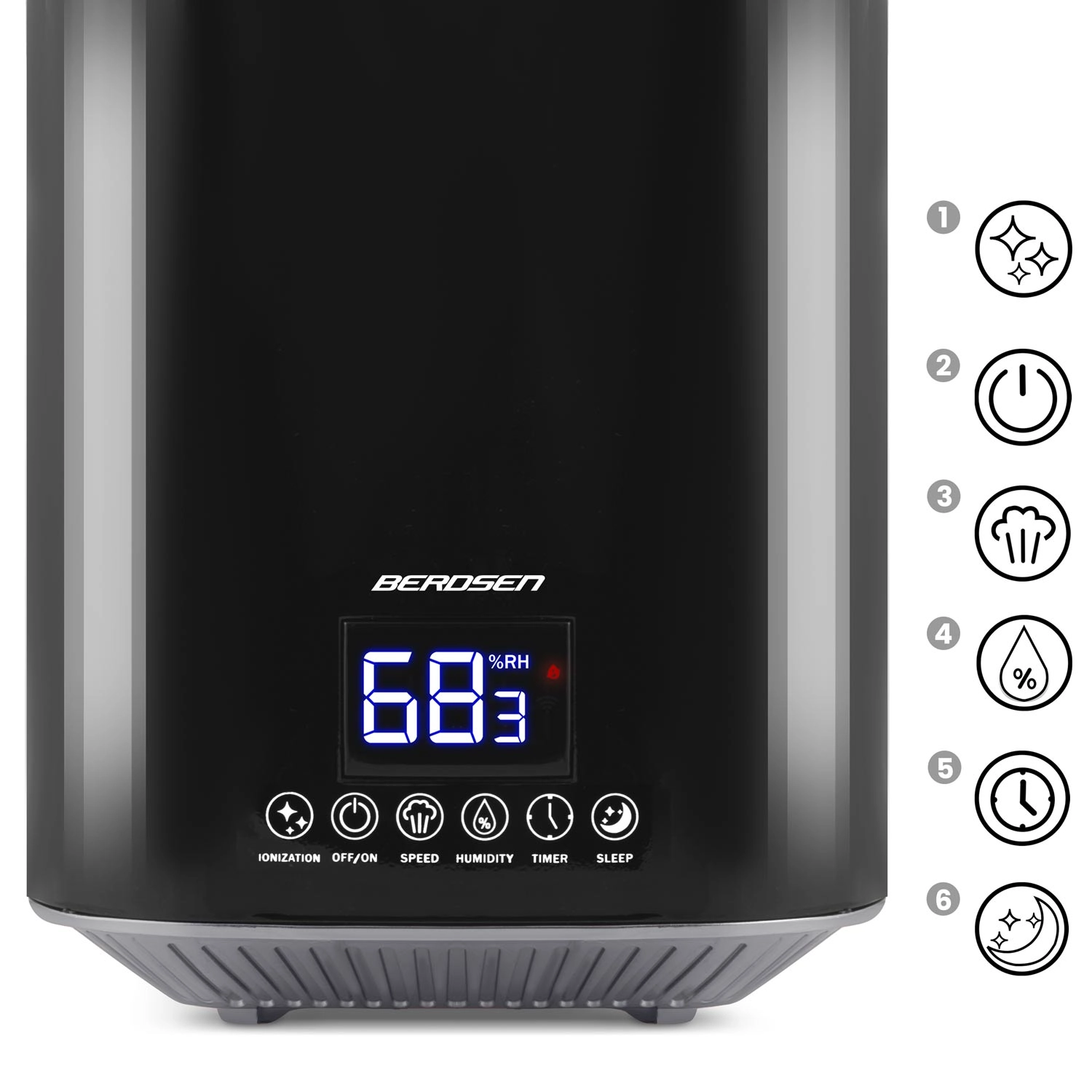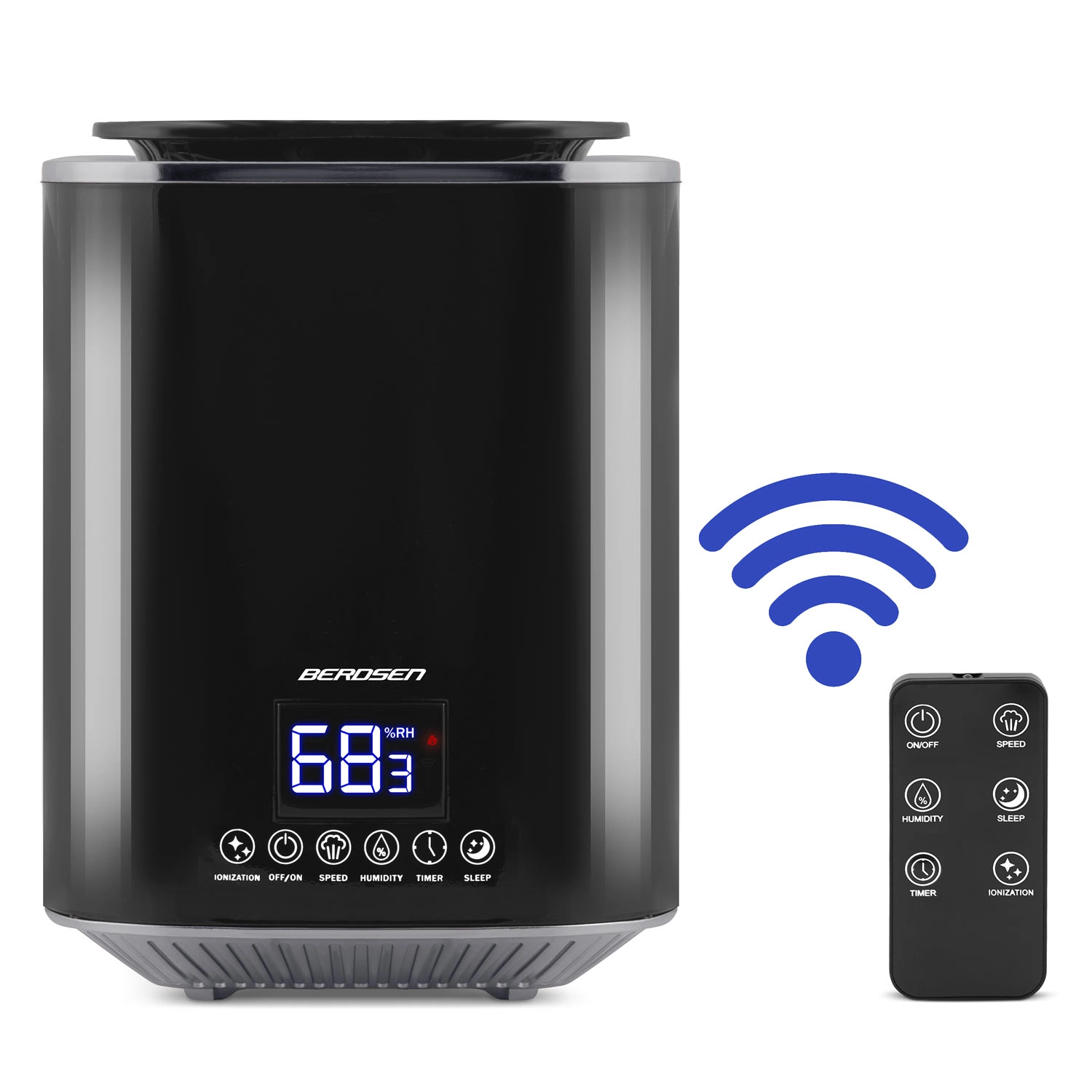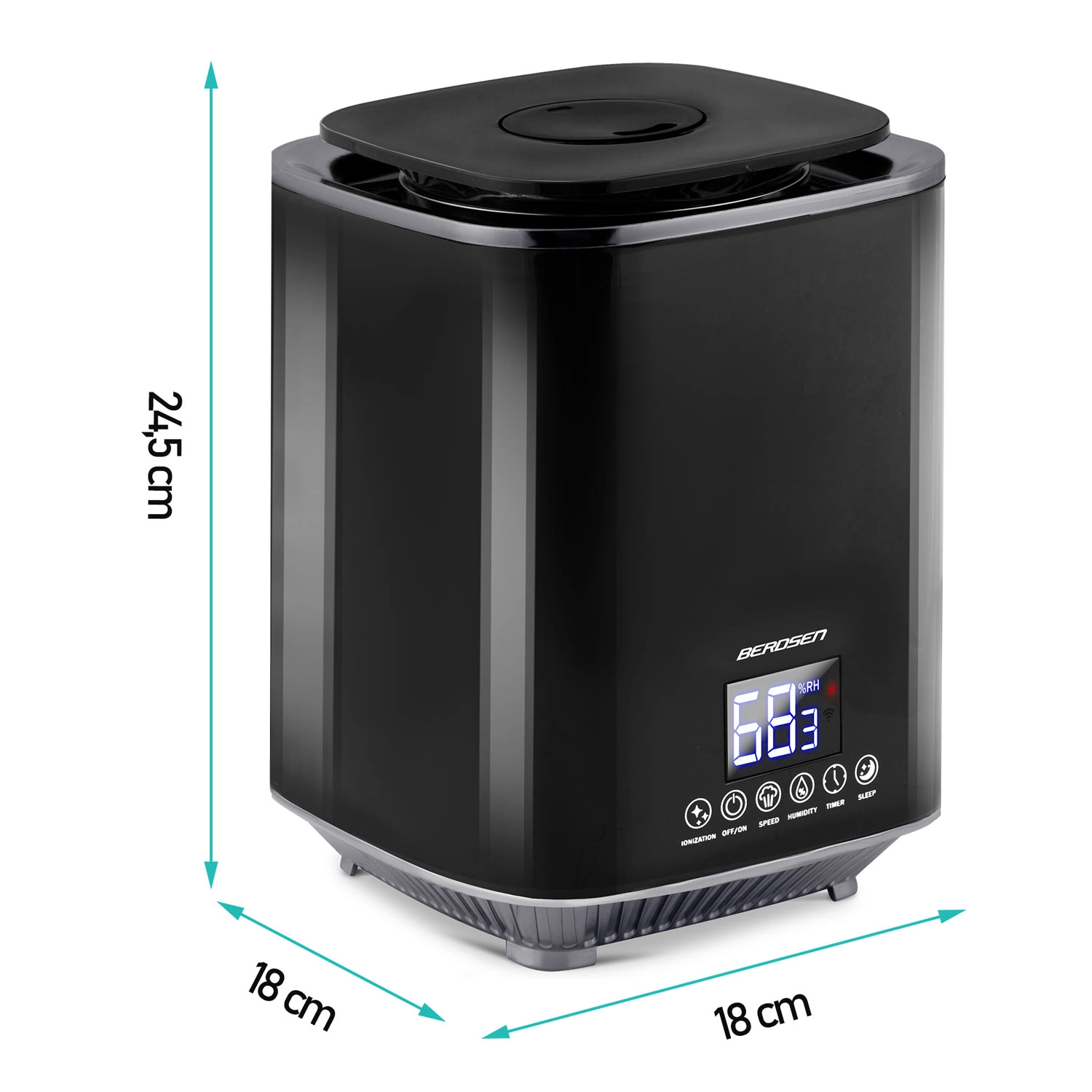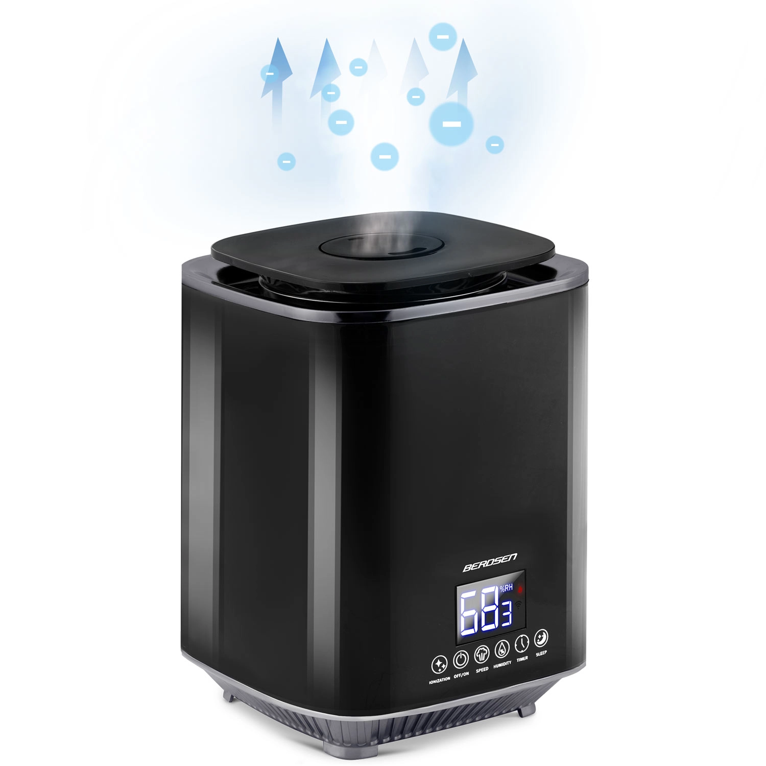 Moderen ultrazvočni vlažilnik zraka BERDSEN z ionizacijo in aromaterapijo zagotavlja zdravo klimo doma in v pisarni. Ponuja zmogljivost do 250 ml/h, velik rezervoar 2,6 l, natančen nadzor vlažnosti s higrostatom 45–90 % in vgrajen higrometer. Udobno upravljanje omogočata LED zaslon na dotik in daljinski upravljalnik, na voljo so časovnik, nočni način in samodejni izklop po izpraznitvi rezervoarja.
