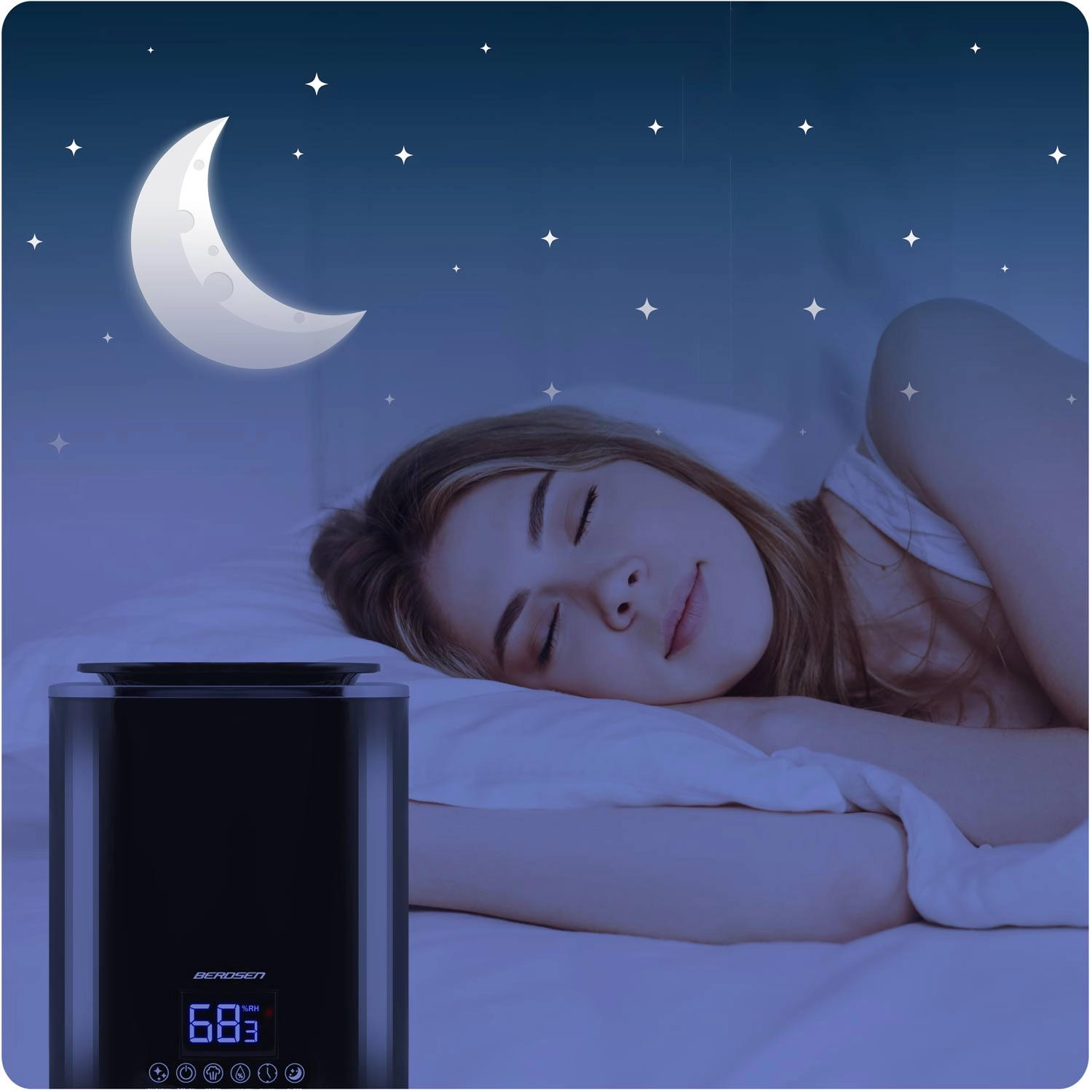 Pameten higrostat (45–90 %) vzdržuje nastavljeno vlažnost in ob njenem doseganju preklopi napravo v pripravljenost. Nočni način zatemni zaslon, naprava pa tiho nadaljuje z delovanjem. Intuitivno upravljanje na dotik dopolnjujeta časovnik 1–9 h in praktičen samodejni izklop ob pomanjkanju vode.