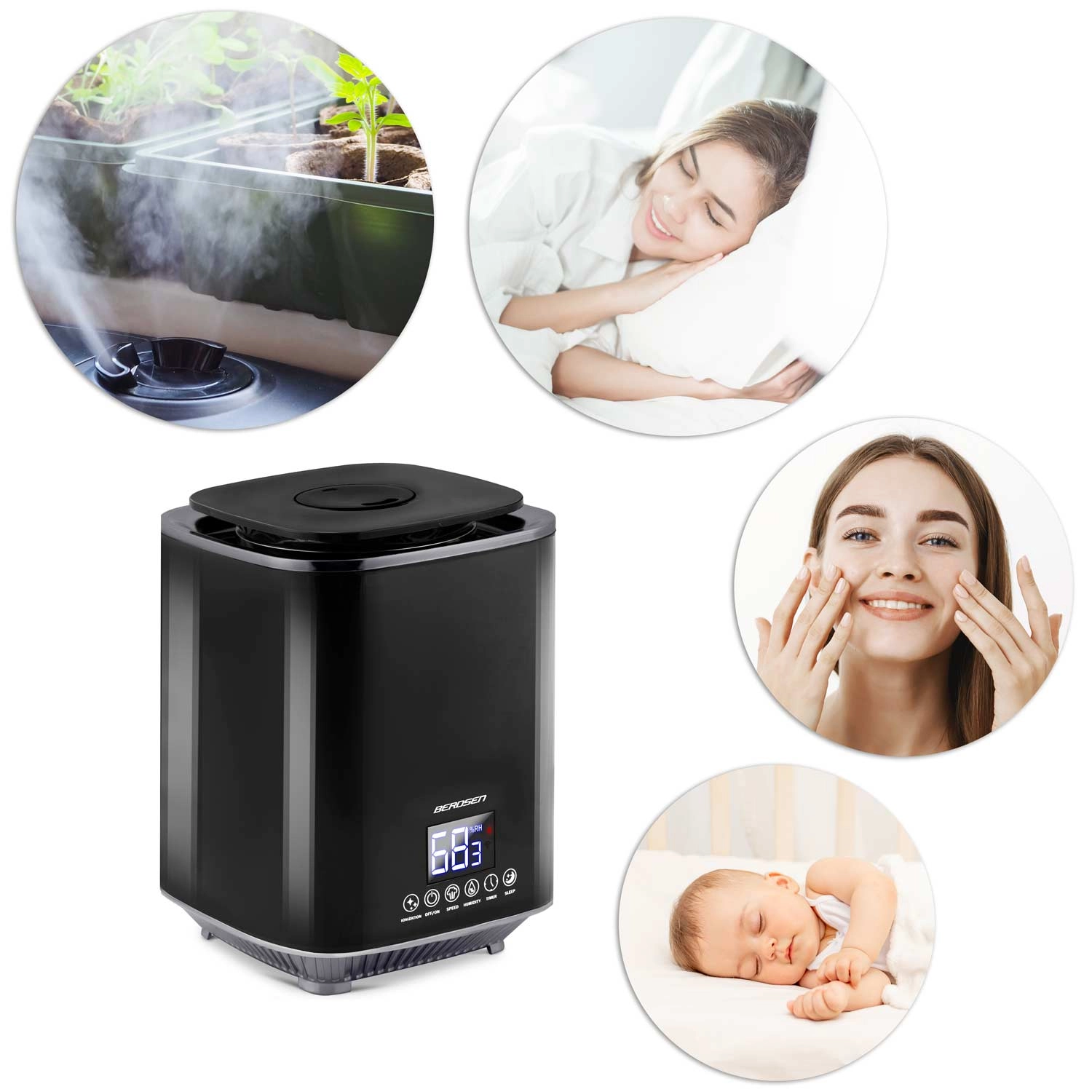 Olajšajte dihalne poti, kožo in rastline. Vlažilnik BERDSEN z nežno hladno meglico hitro poveča vlažnost, medtem ko ionizacija pomaga nevtralizirati prah in alergene. Funkcija aromaterapije omogoča dodajanje priljubljenega eteričnega olja (2–3 kapljice) za prijetno dišeč prostor in sprostitev.