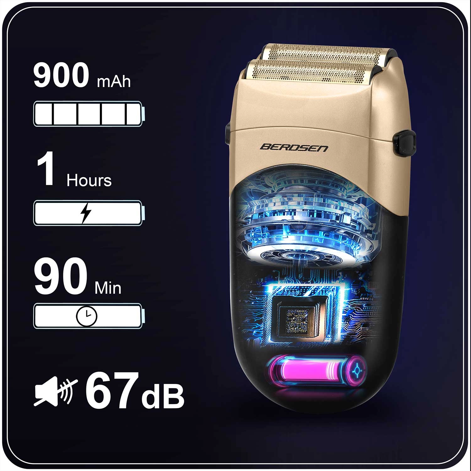 Zmogljiv folijski brivnik BERDSEN za gladko britje in natančne zaključne popravke. Ponuja močan motor 6500–7000 RPM, osvetljen LCD zaslon z indikatorjem baterije, dvojne jeklene folije za nežno in učinkovito britje ter Li‑Ion baterijo 900 mAh za do 60 minut brez kabla. Hitro polnjenje USB‑C (1,5 h), ergonomsko zasnovo in praktične dodatke v paketu.