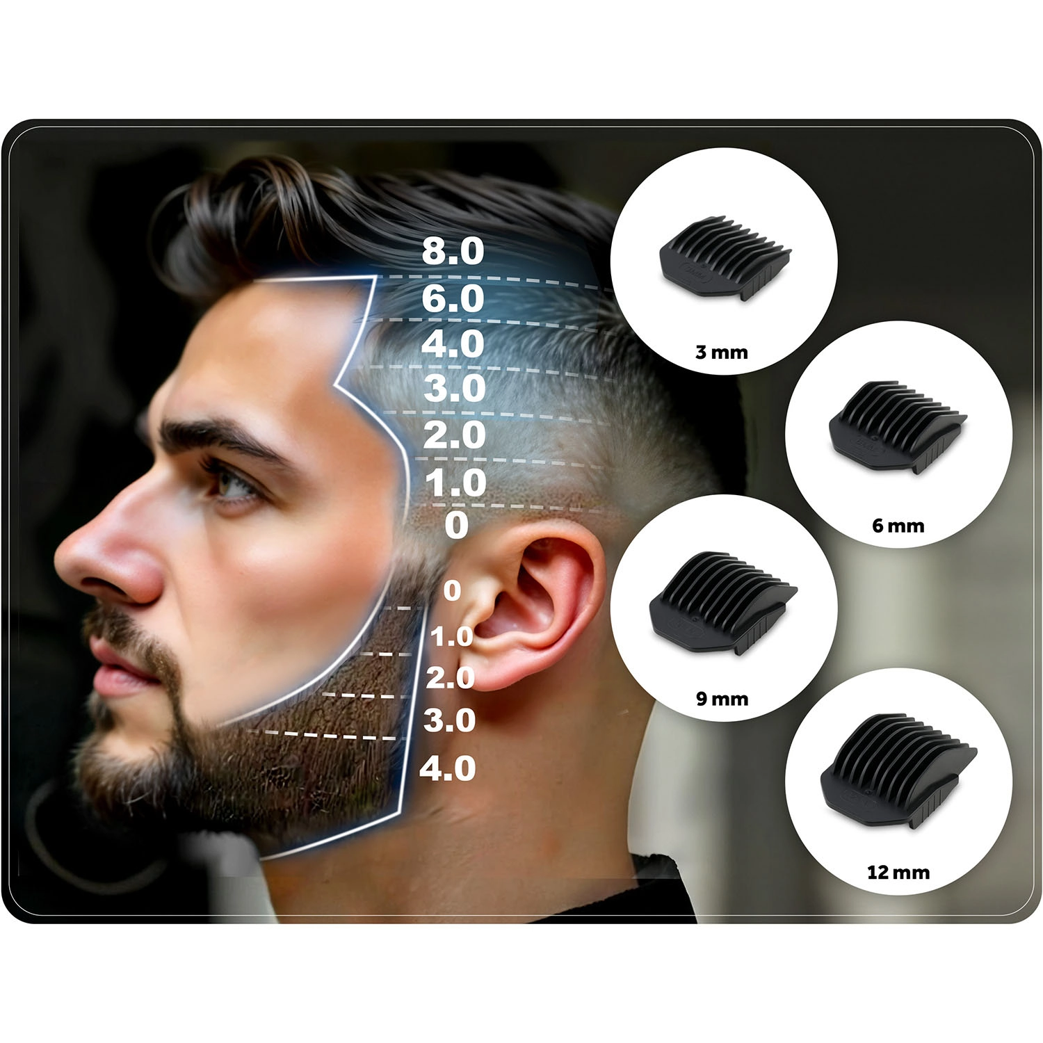 Štirje glavnični nastavki omogočajo gladke prehode, različne dolžine prirezovanja in vsestransko uporabo za lase in brado.