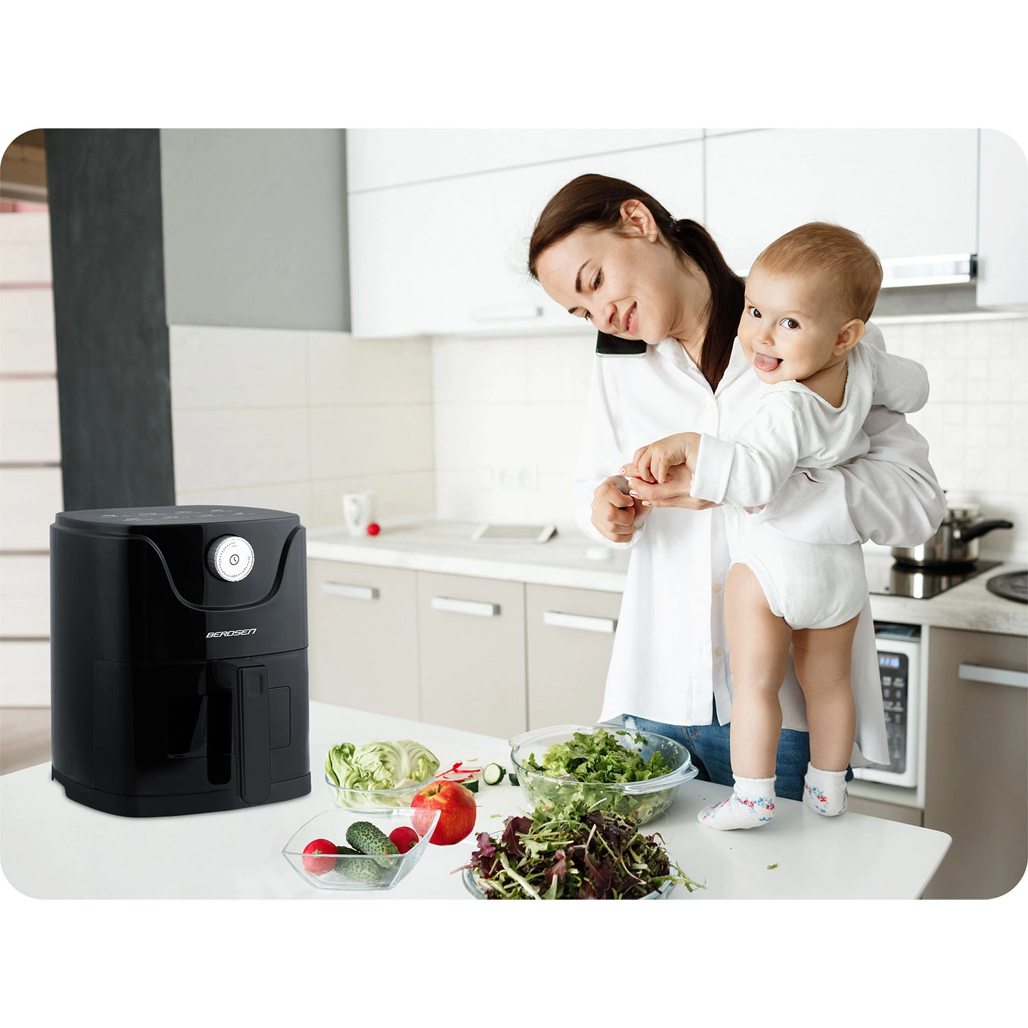 Odkrijte hitro in bolj zdravo kuhanje z zračnim cvrtnikom BERDSEN z močjo 1000 W in kompaktno kapaciteto 2,5 l. Zahvaljujoč cirkulaciji vročega zraka pripravite hrustljav krompirček, sočnega piščanca ali zelenjavo z do 90 % manj maščobe – brez vonjav in nereda. Ponuja 8 samodejnih programov, košaro z okencem in LED osvetlitvijo za nadzor brez odpiranja ter preprosto upravljanje z vrtljivim gumbom.
