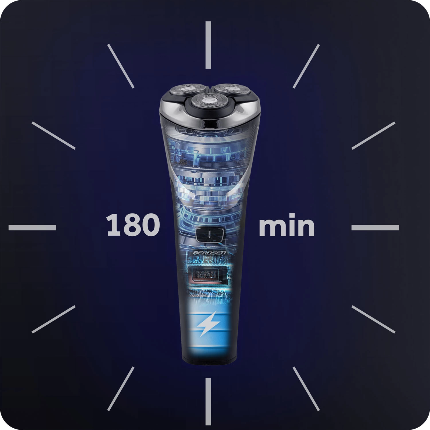 Močan motor zagotavlja stabilno zmogljivost, medtem ko zmogljiva Li‑Ion baterija 2000 mAh omogoča do 3 ure neprekinjenega delovanja. S hitrim polnjenjem prek USB‑C je brivnik pripravljen za uporabo že v 1,5 ure. Kompaktna ergonomska oblika odlično sede v roko, funkcija Travel Lock pa prepreči neželen vklop na poti.