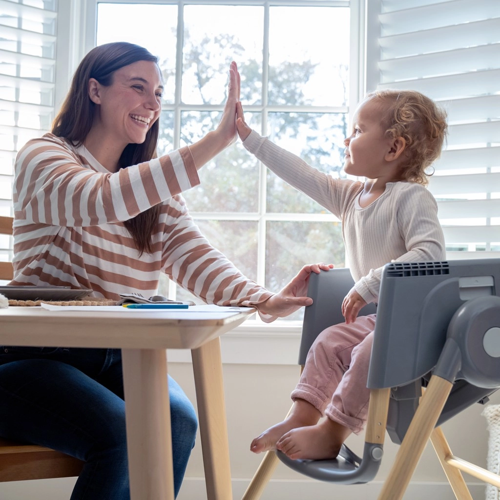 Starši bodo cenili pladenj s 3 položaji z držalom za pijačo in odstranljivo vložko za pomivalni stroj, pralne prevleke ter varnostne pasove, ki se prilagodijo starosti otroka. Nastavljiva višina in udoben naslon za noge podpirata zdravo sedenje v kotu 90/90/90, da noge ne visijo in otrok stabilno sedi pri mizi.