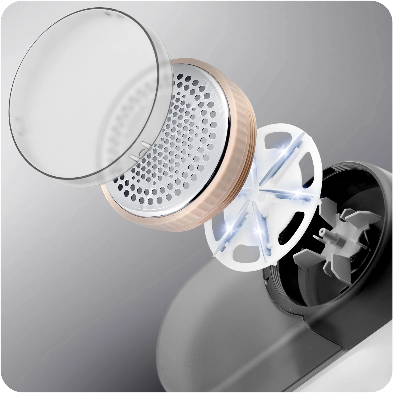 Odporna nerjavna rezila učinkovito odstranjujejo mucke in kroglice, medtem ko oblikovana zaščitna mrežica ščiti vlakna pred zatikanjem.