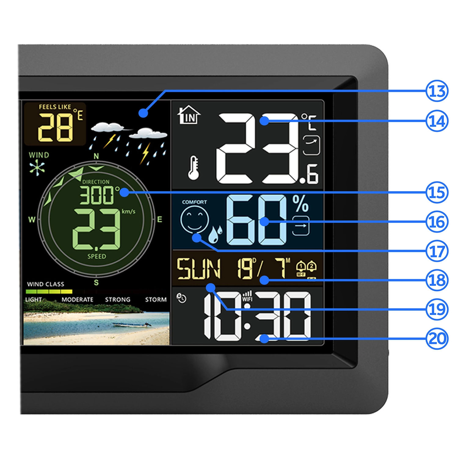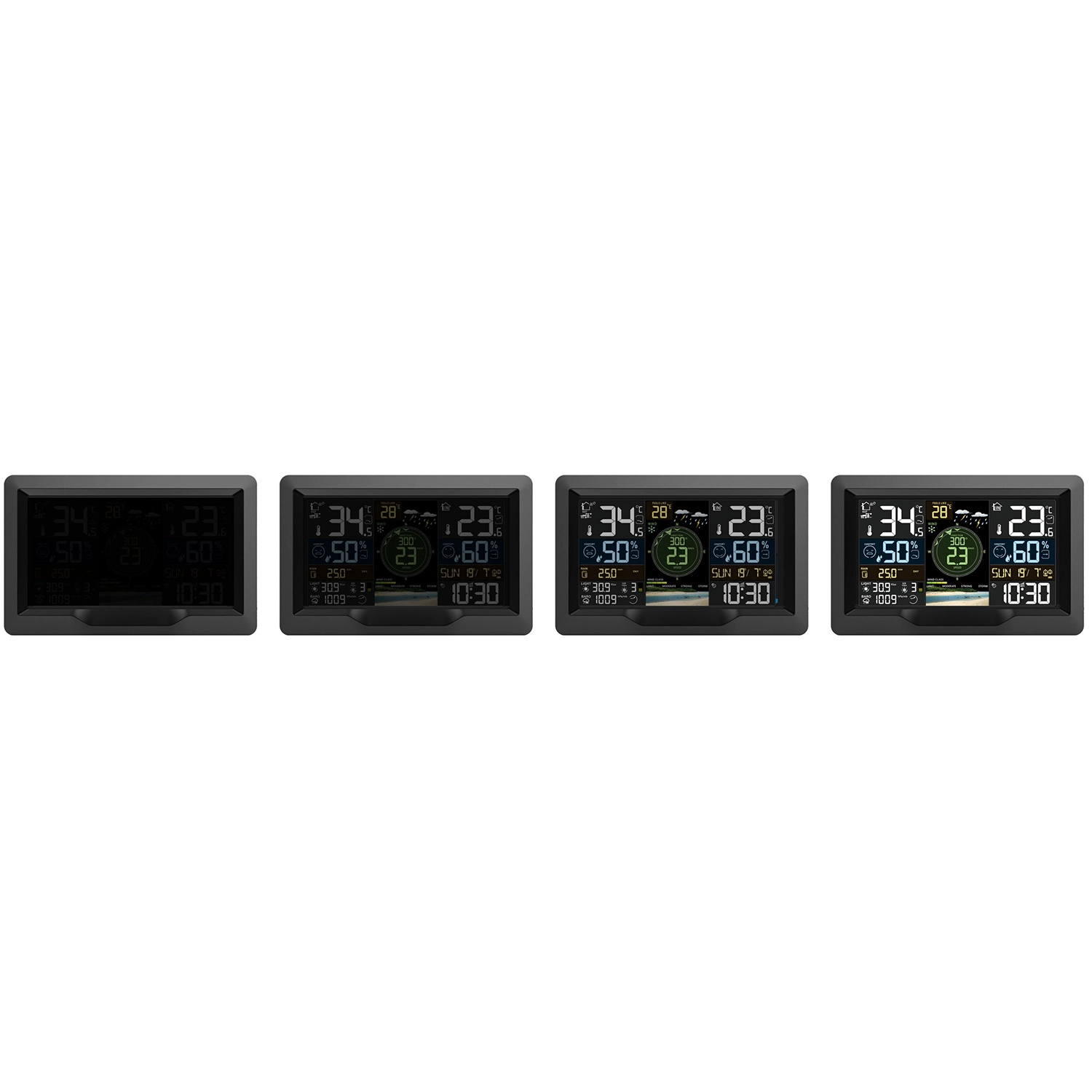 Velik večbarvni zaslon prikazuje temperaturo, vlago, veter, tlak, čas in napoved s pomočjo preglednih ikon. Podatki so berljivi podnevi in ponoči zahvaljujoč zatemnilniku.