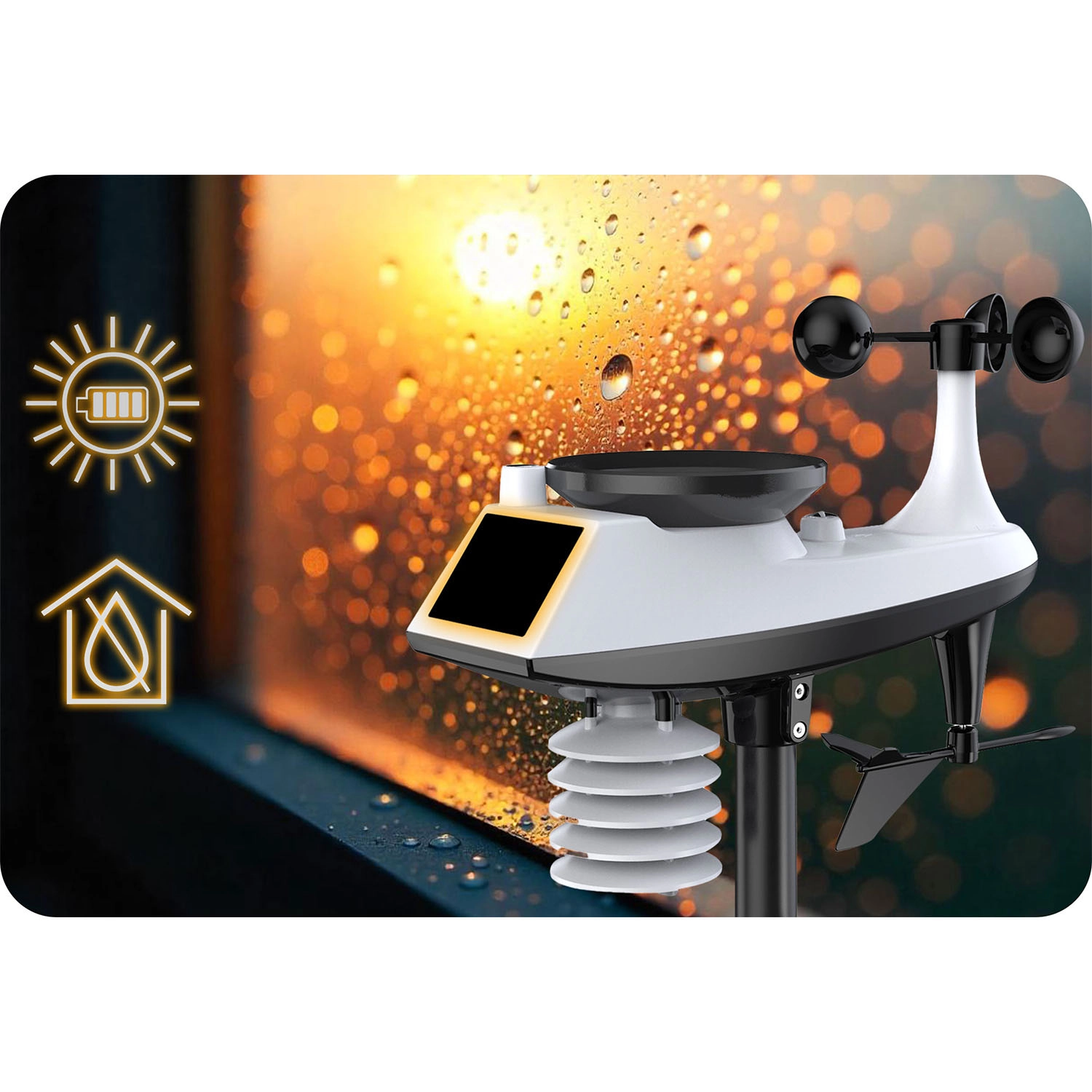 Zunanji senzor z anemometrom, vetrnico in merilnikom padavin zagotavlja natančne podatke o hitrosti in smeri vetra ter o količini padavin – idealno za načrtovanje aktivnosti na prostem.