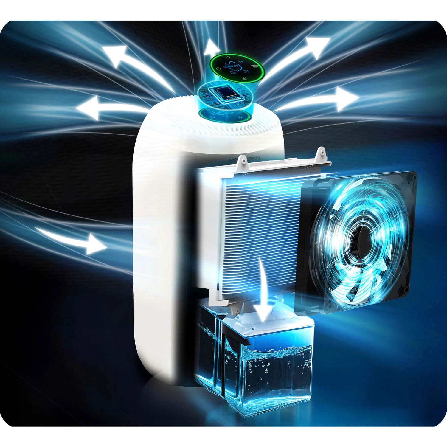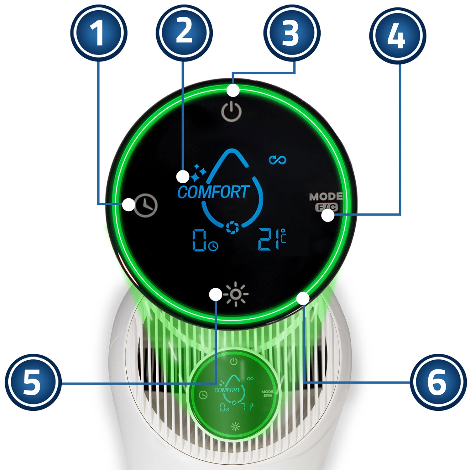 Upravljanje je preprosto prek pregledne plošče na dotik z načini Razvlaževanje / Avto / Noč, nastavitvijo časovnika 8–48 h, preklapljanjem LED luči in izbiro prikaza temperature °C/°F. Velik odstranljiv rezervoar za vodo s prostornino 1650 ml z indikatorjem nivoja zmanjšuje pogostost praznjenja. Moderna termoelektrična tehnologija Peltier zagotavlja zanesljivo učinkovitost do 750 ml/dan ob nizki porabi.