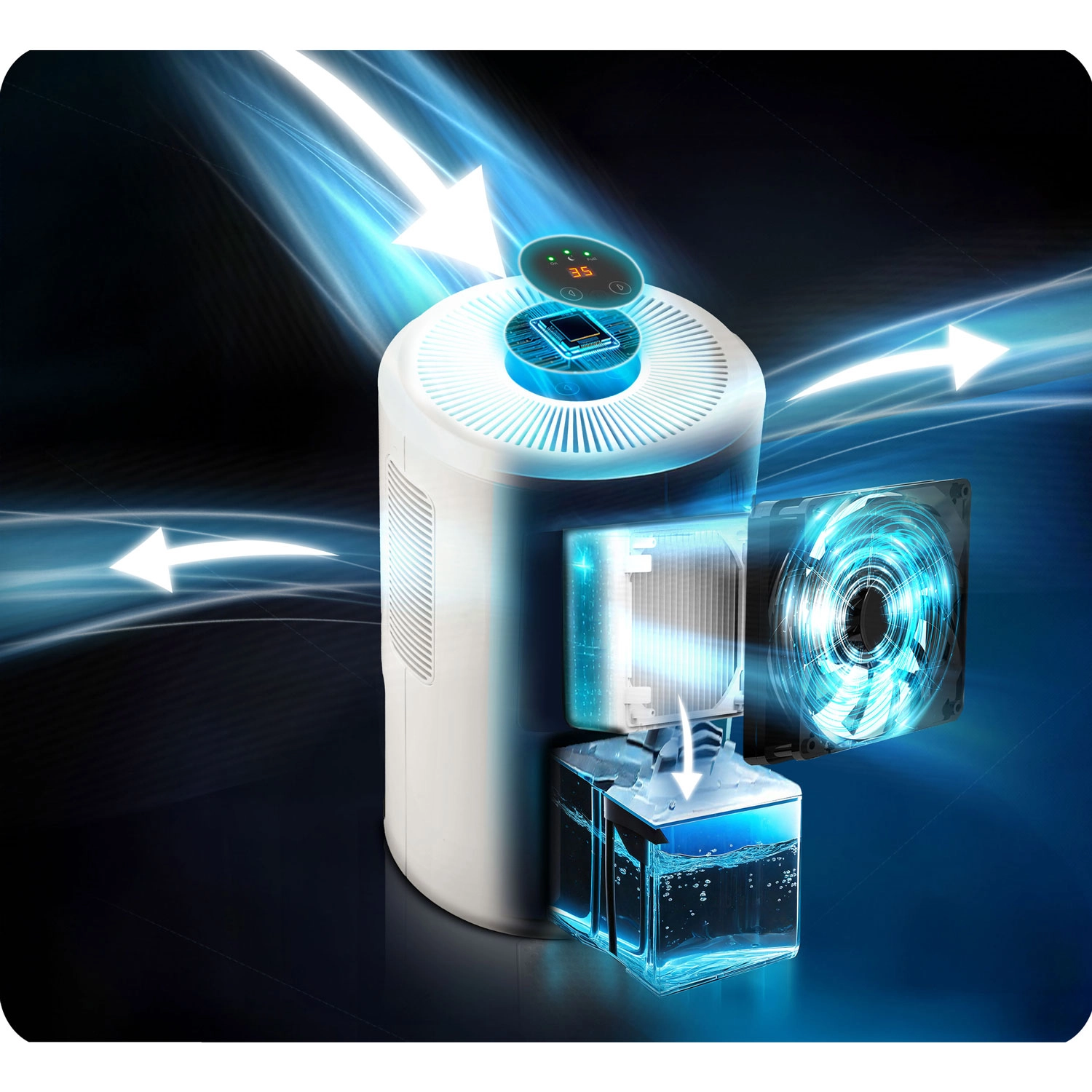 Peltierjeva tehnologija zagotavlja nizko porabo 60 W in tiho delovanje okoli 34 dB – idealno za spalnico in kopalnico.
