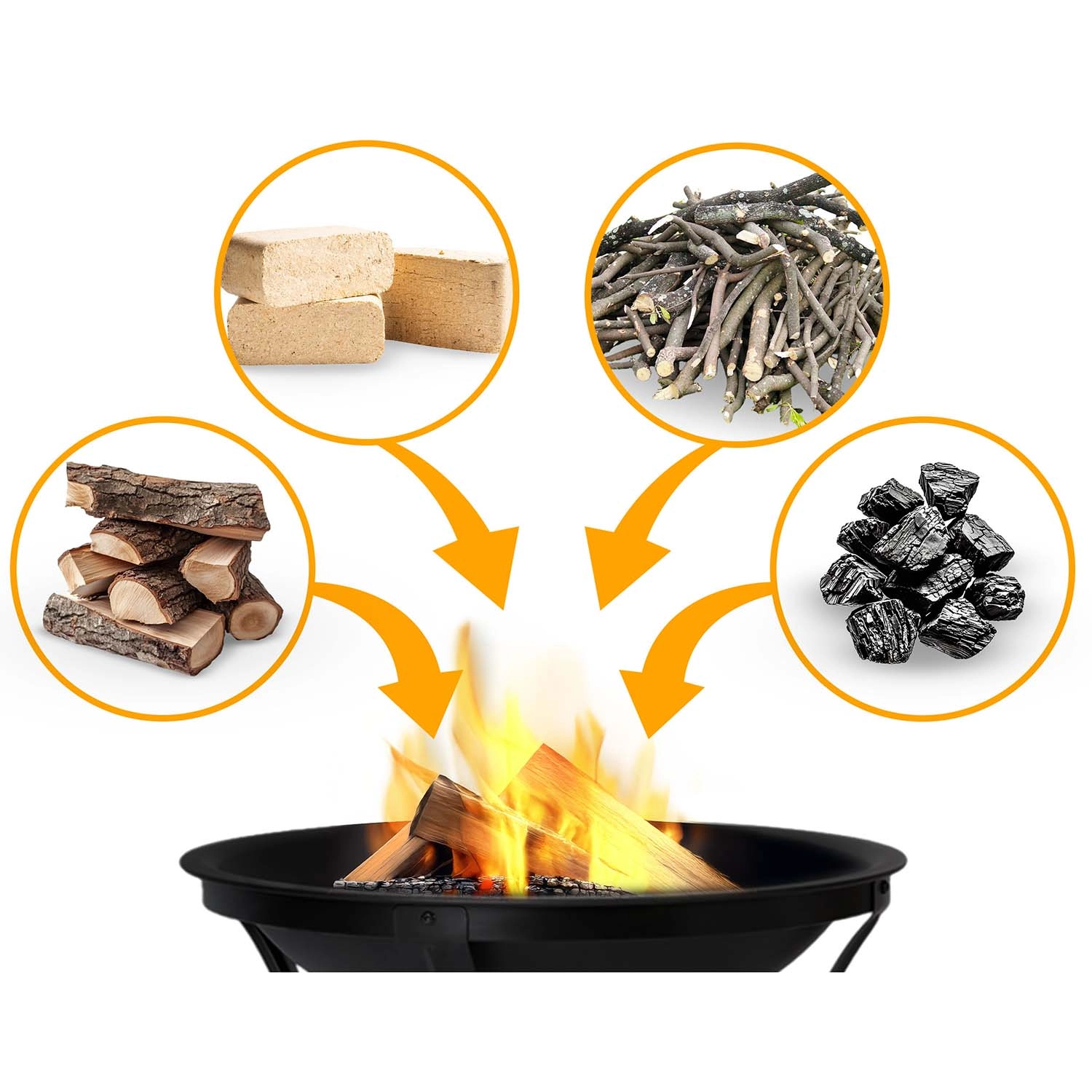 Kurite z lesom, briketi, vejami ali ogljem. Odprtina na dnu in optimalna globina posode omogočata hitro prižiganje in stabilno gorenje.