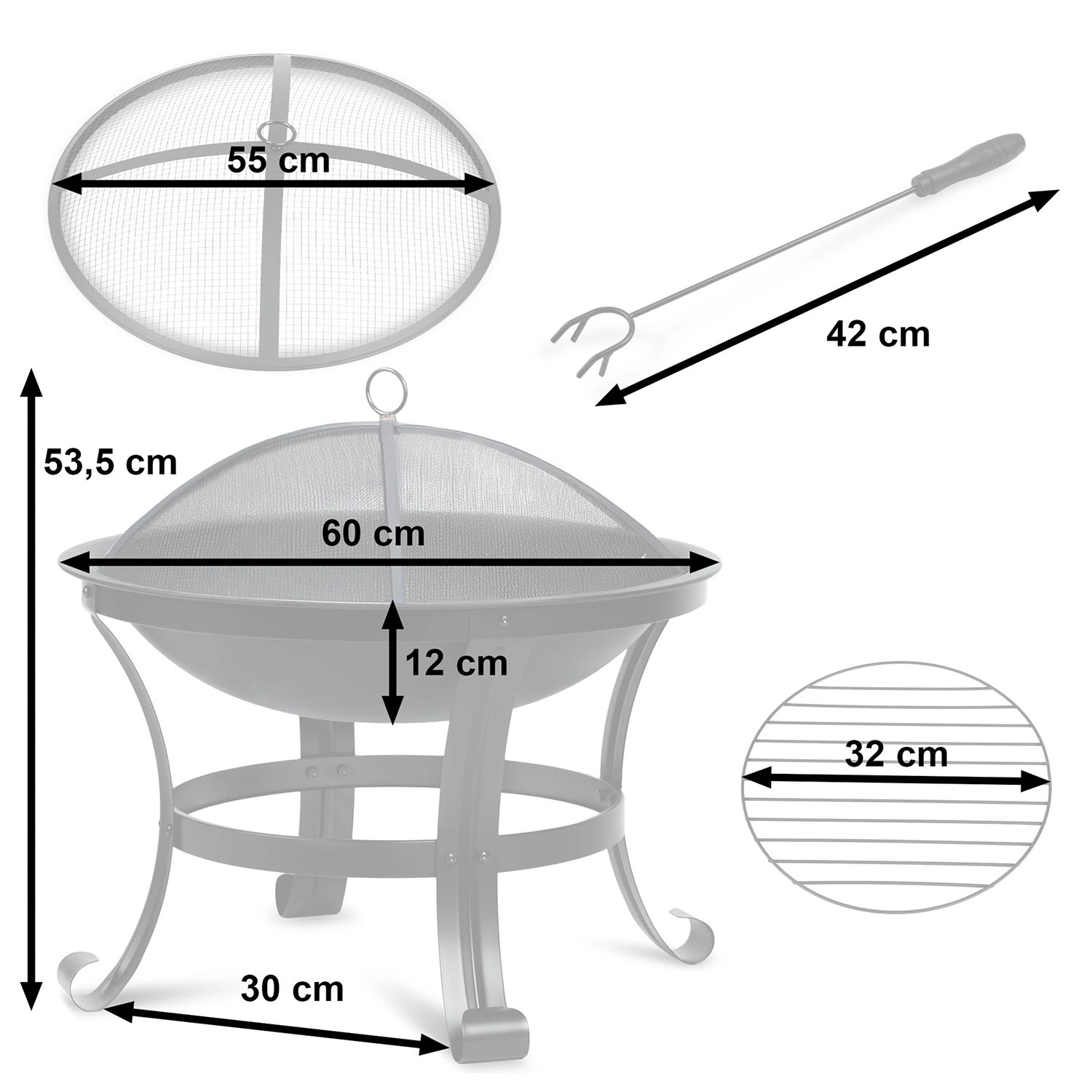 Zahvaljujoč premišljeni ventilaciji in zadostni globini posode se ogenj hitro razplameni in gori stabilno z lepim plamenom. Kurišče ima čvrste noge za zanesljivost na terasi in na travniku, praktične ročaje za prenašanje, v paketu pa dobite tudi kavelj/poker za lažje dodajanje goriva.