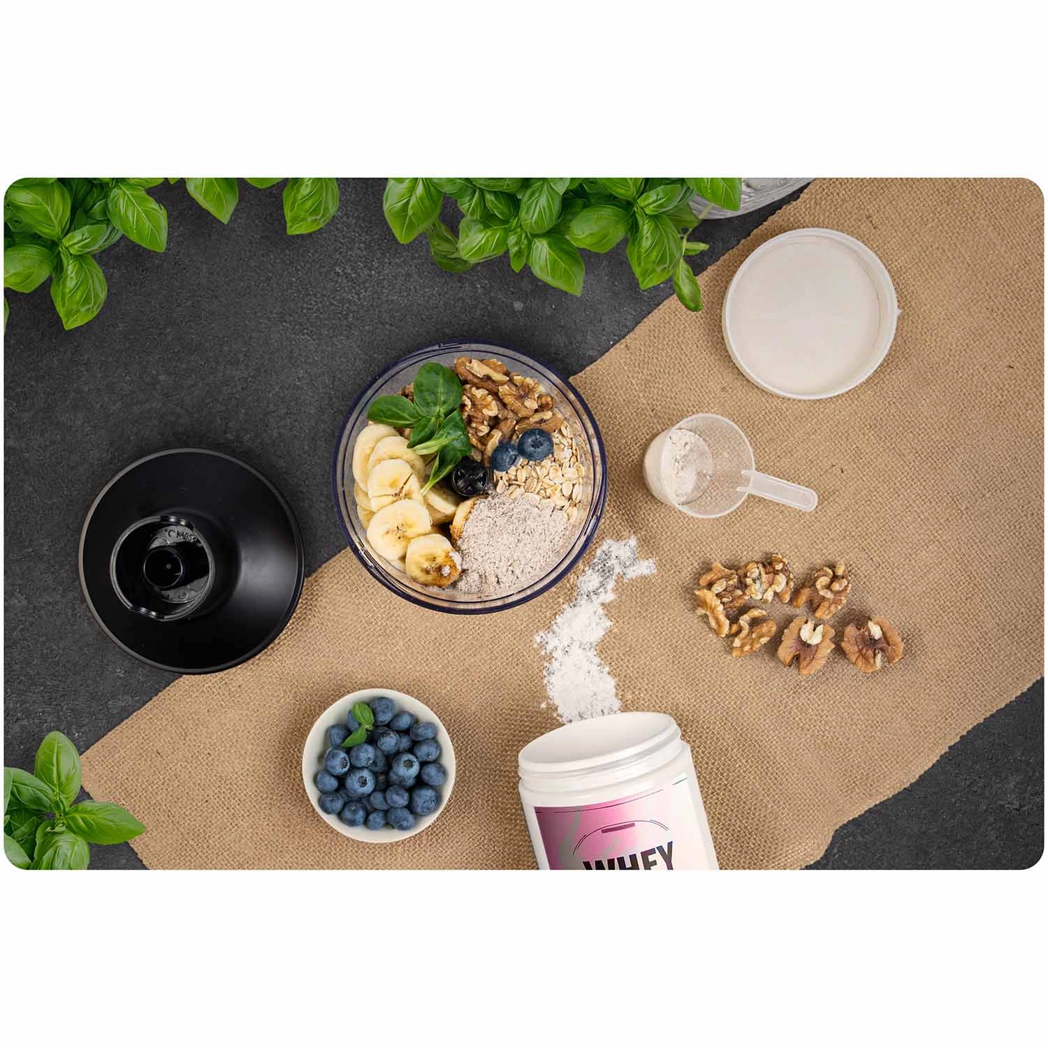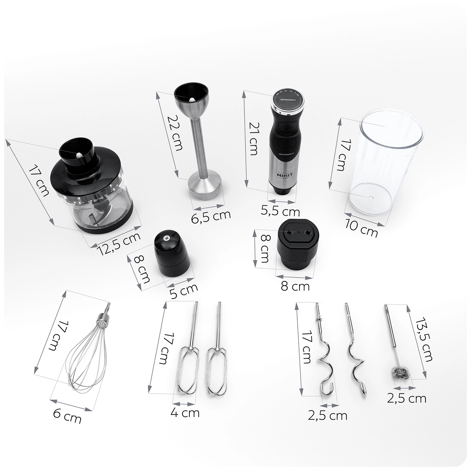 Komplet pokriva do 6 funkcij: mešanje, sekljanje, stepanje, gnetenje, mešanje/rahlo vmešavanje in penjenje mleka. Praktični dodatki vključujejo mini sekljalnik 600 ml, visoko merilno posodo 1000 ml s pokrovom (brez BPA), metlico za stepanje, dvojni metlici, gnetilna kavlja in palični nastavek z zaščitnim zvonom. 20 stopenj hitrosti vam daje natančen nadzor nad konsistenco juh, omak, smutijev in krem.