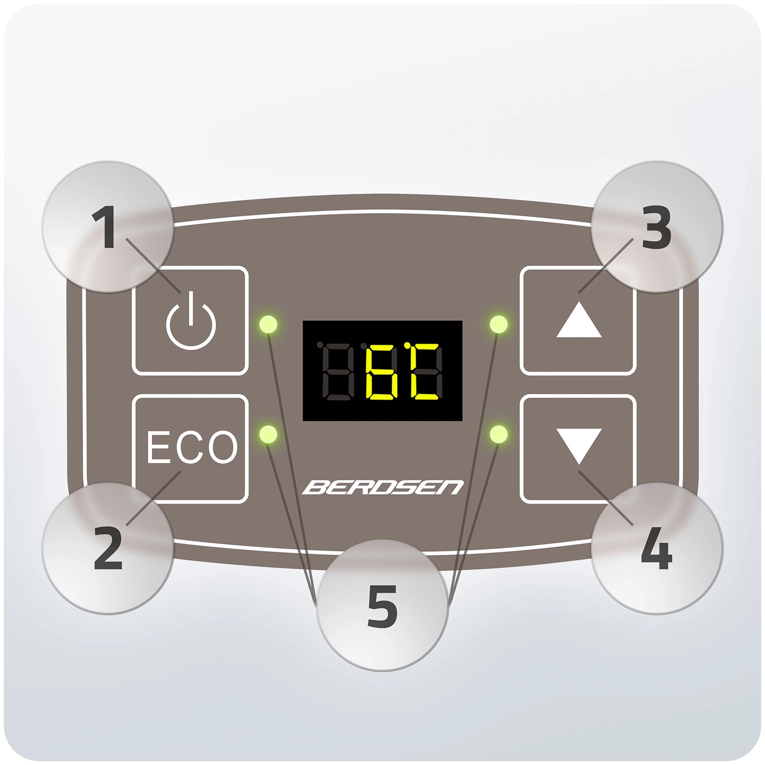 - Enostavno upravljanje: gumb ON/OFF, izbira ECO, natančna nastavitev temperature, signalne diode.